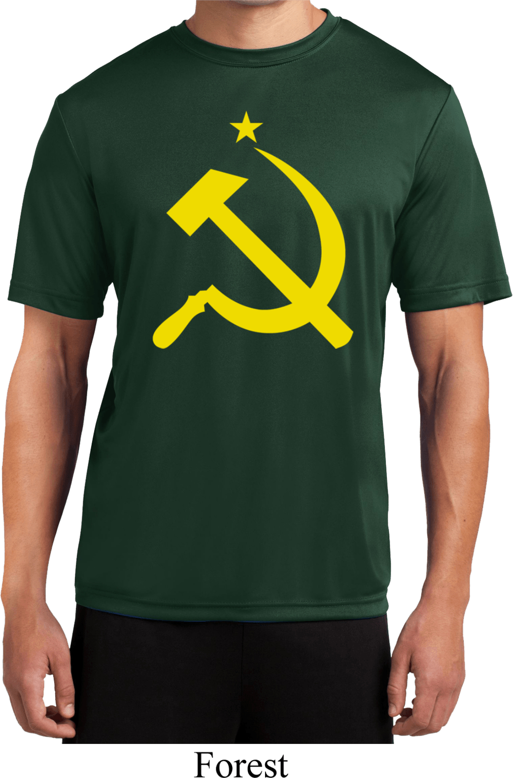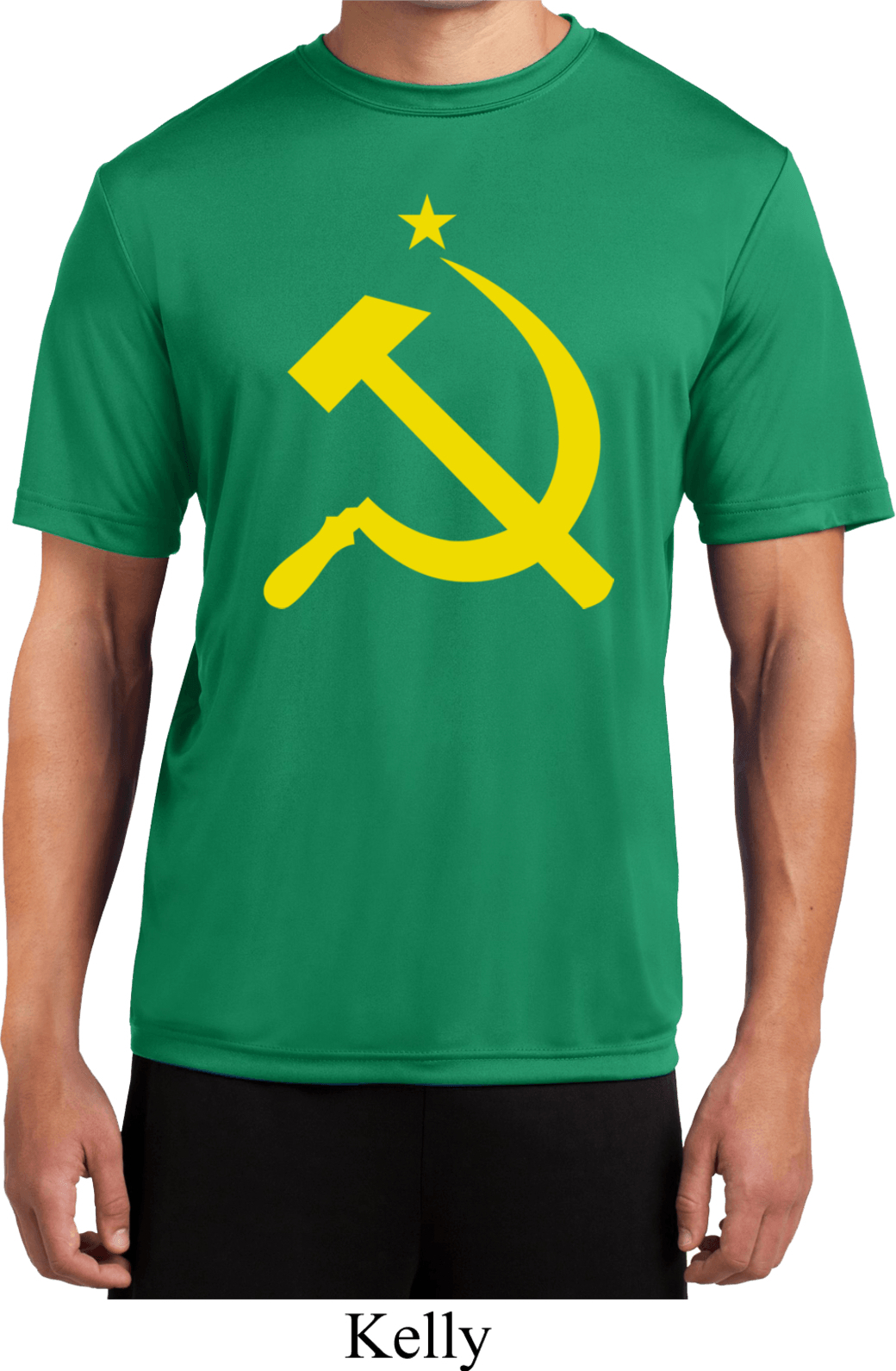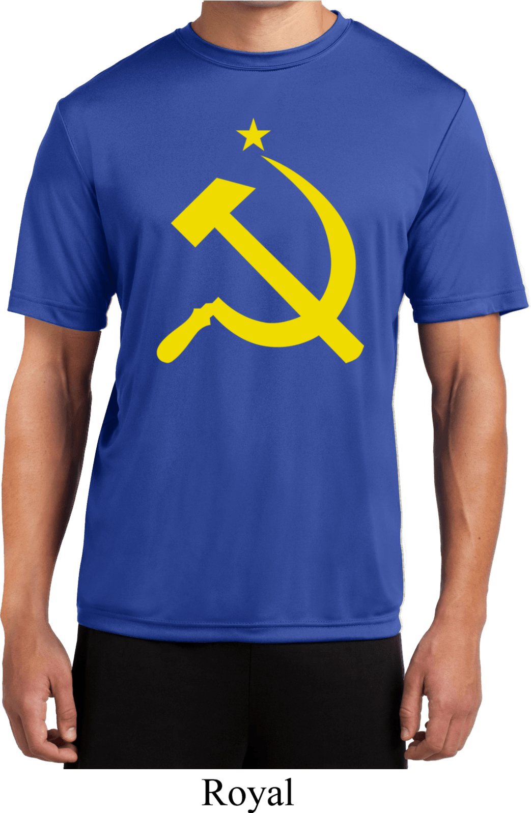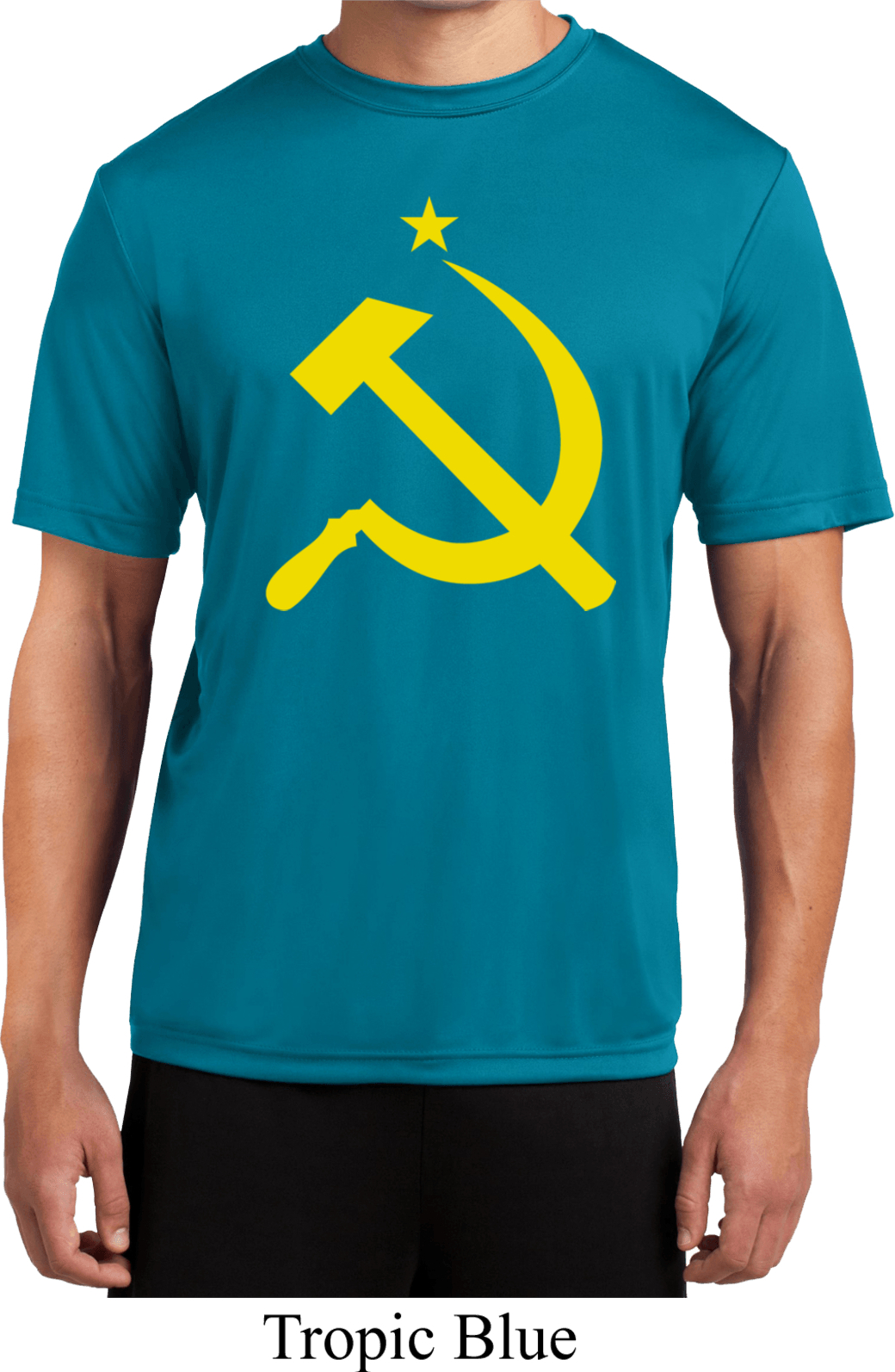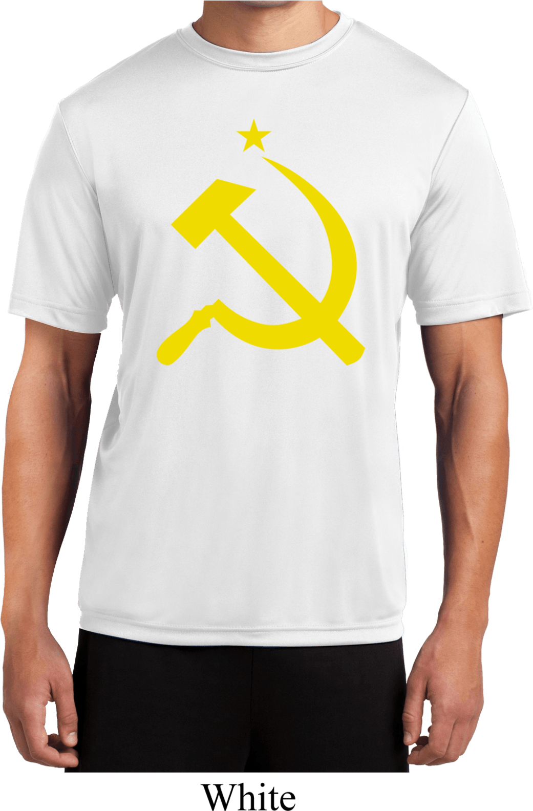 | | Mens Soviet Shirt Yellow Hammer And Sickle Moisture Wicking TeeMens Soviet Shirt Yellow Hammer And Sickle Moisture Wicking Tee 100% polyester Available in Small, Medium, Large, XL, 2XL, 3XL & 4XL Also available in colors Black, Cardinal, Carolina Blue, Deep Orange, Forest, Kelly, Maroon, Navy, Purple, Red, Royal, Sand, Silver, Tropic Blue, and White |