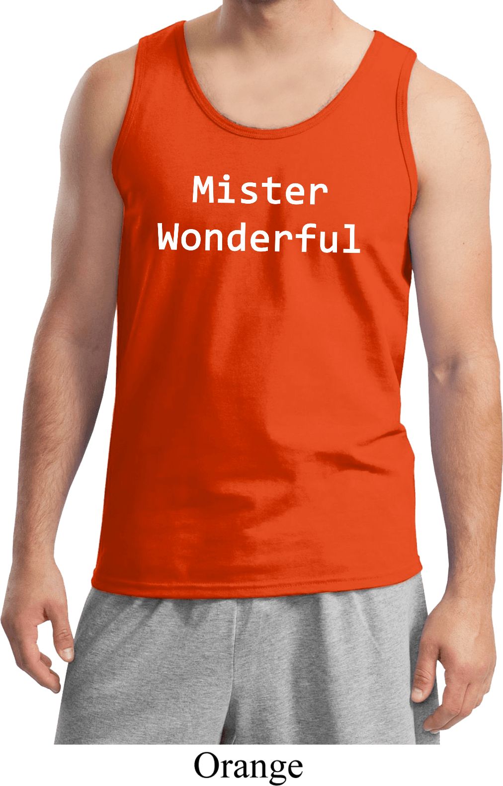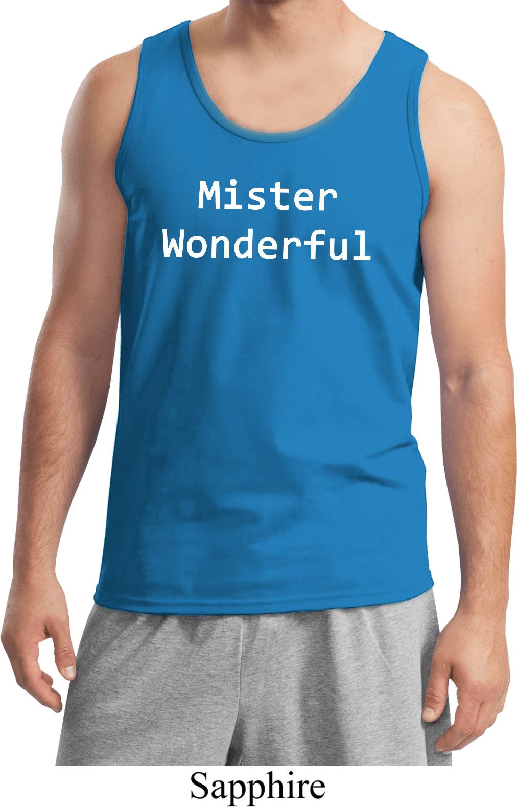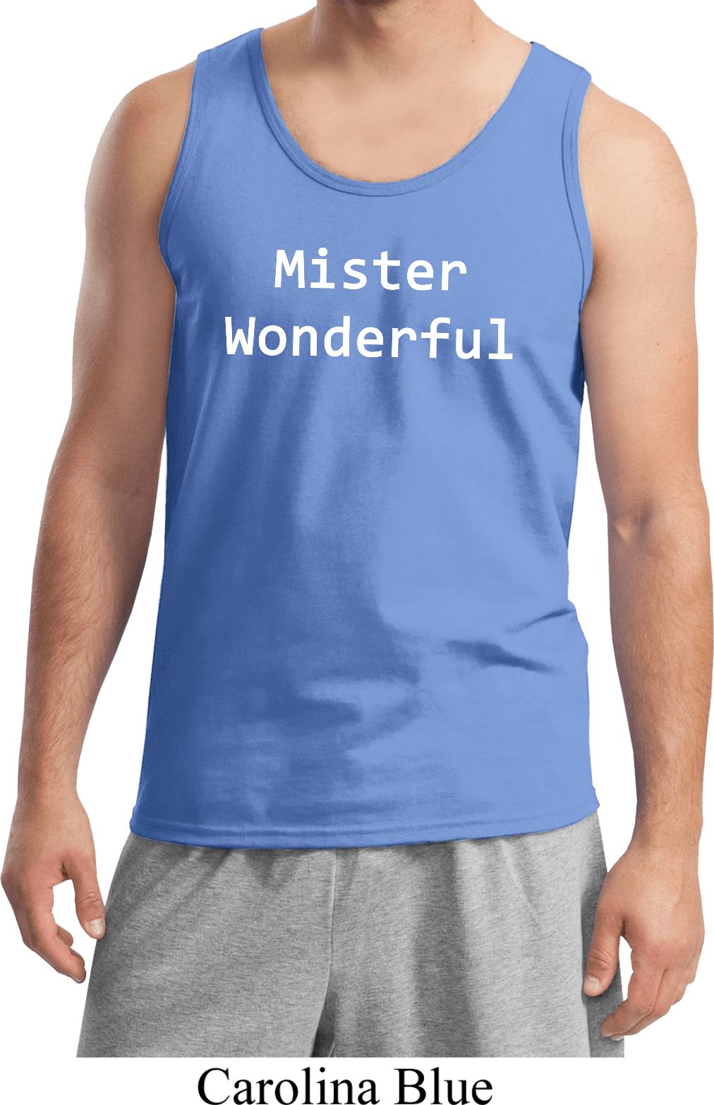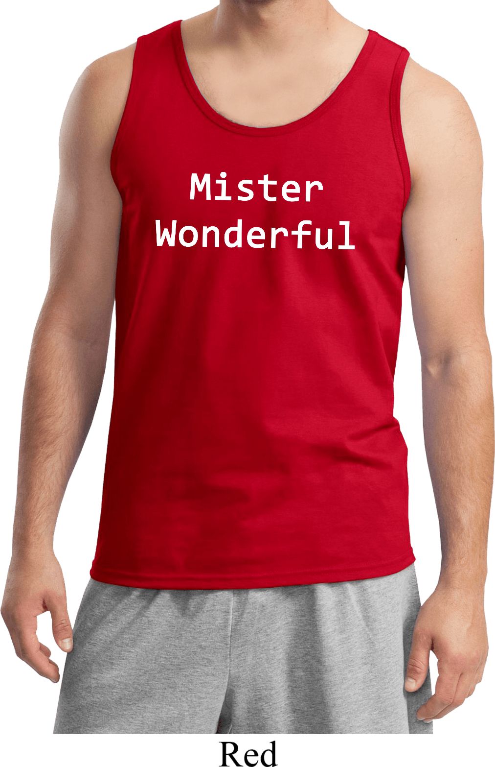 | | Mister Wonderful Mens Tank TopMister Wonderful Mens Tank Top Makes the perfect gift for the Mr. Wonderful in your world! 100% cotton Ash is a cotton/poly blend Available in Small, Medium, Large, XL & 2XL Also available in colors Black, Cardinal, Carolina Blue, Charcoal, Navy, Orange, Purple, Red, Royal, Sapphire, and Sports Grey ![]() |