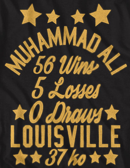 This cool men's tee shirt shows Muhammad Ali's incredible fight record of 56 wins, 5 losses and 37 KOs!