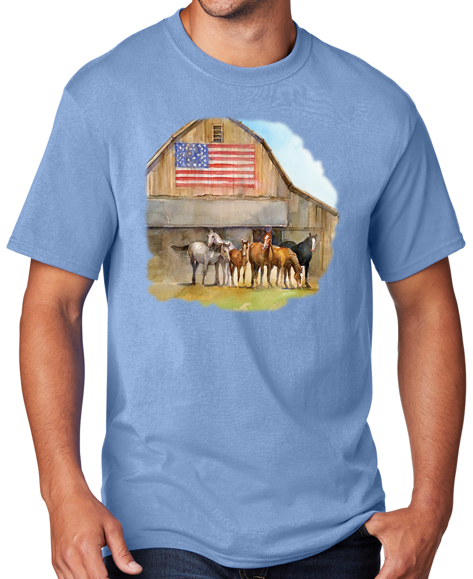 | | Horses Outside Patriotic Flag Barn Adult T-shirt - Light BlueThis fantastic bit of nostalgia brings us back to the simpler days. 6 majestic horses outside an Americana style barn on a fantastic cotton tee 100% Cotton material Unisex adult sizes (see size chart in image gallery) ![]() |