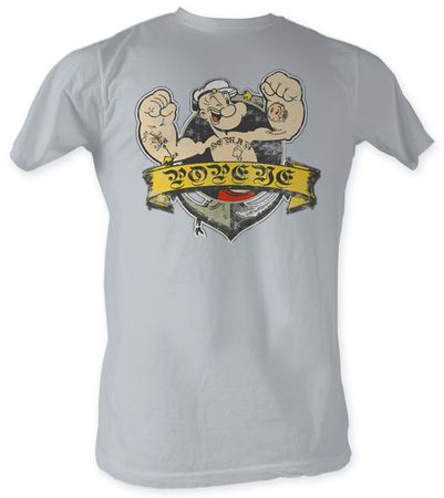 This silver t-shirt features a distressed image of Popeye tattoo .