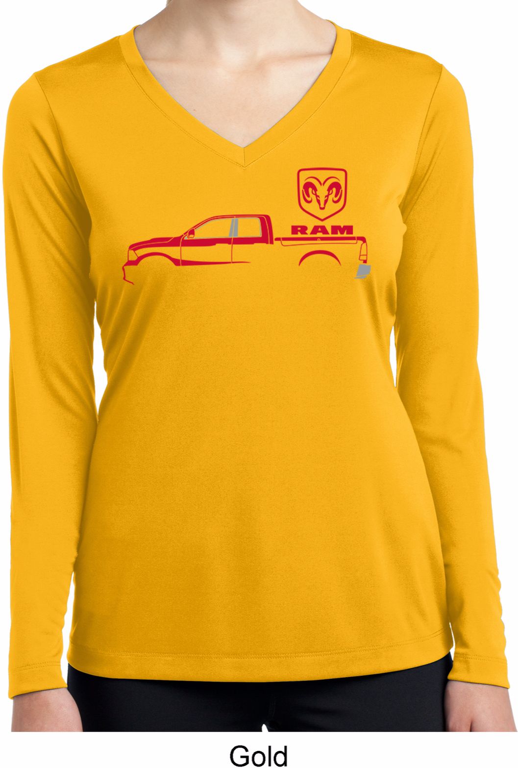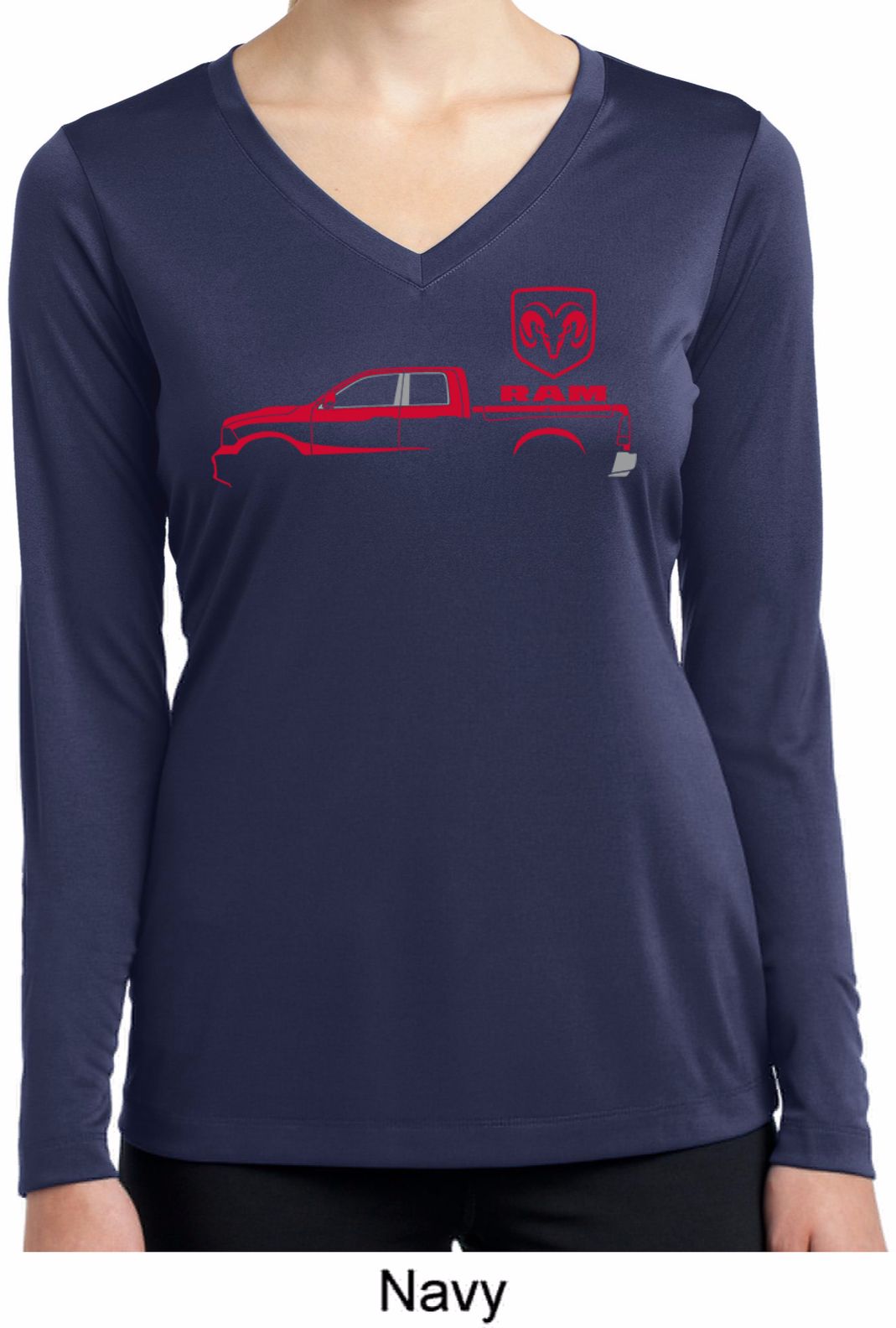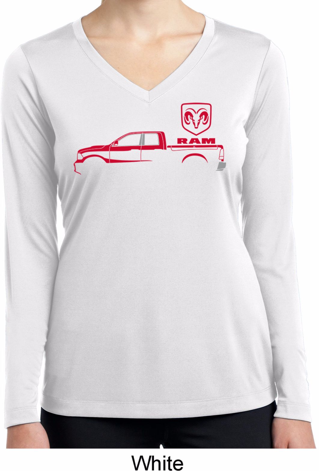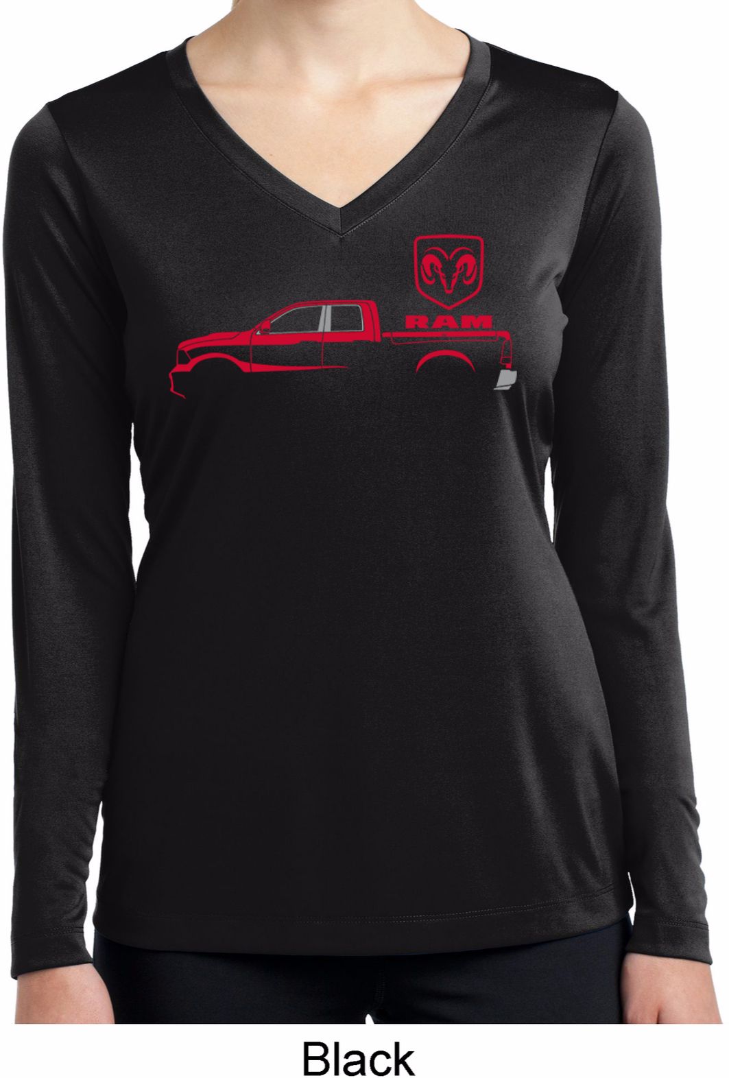 | | Red Dodge Ram Silhouette Ladies Dry Wicking Long SleeveA ladies dry wicking long sleeve v-neck featuring a Dodge Ram silhouette in red. Our ladies shirt is made of 100% polyester. A perfect gift for all who drive a Dodge Ram Truck! Available in sizes Small through 4XL. Machine wash cold with like colors; dry low heat. ![]() |