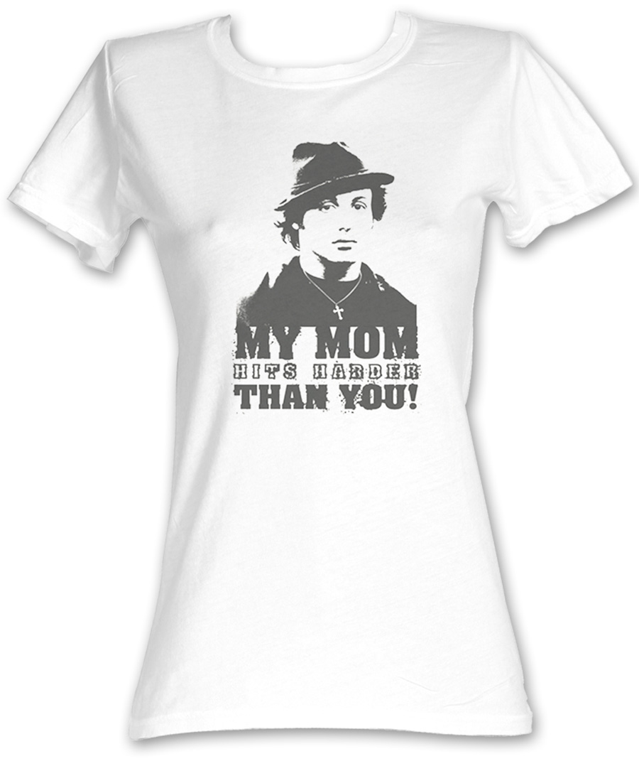 | | Rocky Juniors T-shirt My Mom Hits Harder White Tee ShirtThis Rocky White Juniors T-shirt features Rocky with the slogan “My Mom Hits Harder Than You.” Our Rocky T-shirt is an incredible 100% preshrunk cotton baby doll t-shirt for any Rocky fan. Rocky is a widely known American Sports Drama Movie series from 1976-2006 produced by Robert Chartoff and Irwin Winkler. Available in Small, Medium, Large, XL! Officially Licensed! |