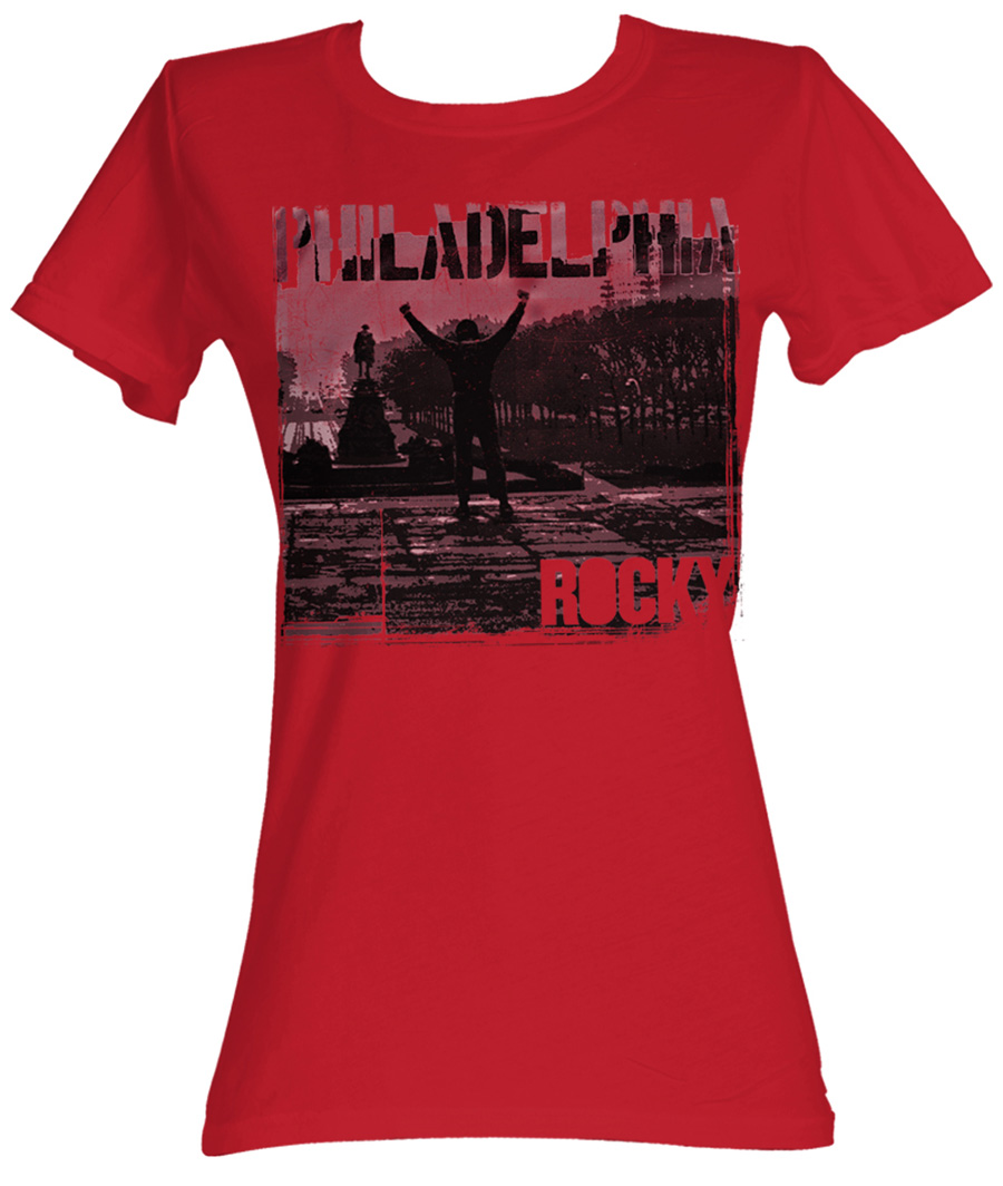| | Rocky Juniors T-shirt Philadelphia Classic Red Tee ShirtThis Rocky Red Juniors T-shirt features Rocky with his arms in the air with Philadelphia written above and Rocky written below. Our Rocky T-shirt is an incredible 100% preshrunk cotton baby doll t-shirt for any Rocky fan. Rocky is a fantastic American Sports Boxing Film written by and starring Sylvester Stallone. Available in Small, Medium, Large, XL! Officially Licensed! |