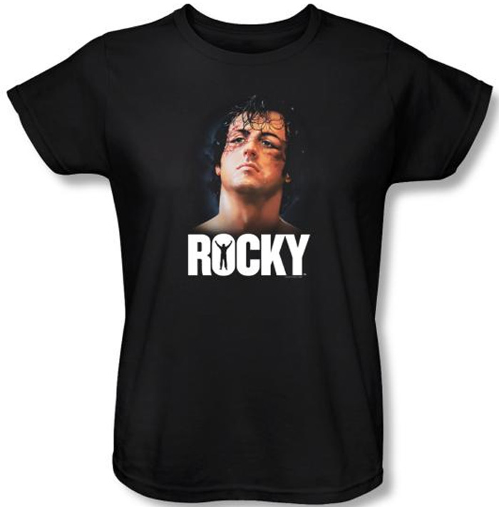 | | Rocky Ladies T-shirt The Champ Classic Black Tee ShirtThis Rocky Black Ladies T-shirt features Rocky as a Champ at the end of a match. Our Rocky Ladies T-shirt is an incredible 100% preshrunk cotton t-shirt for any Rocky fan. Rocky is a fantastic American movie series starring Sylvester Stallone as Rocky. Available in Small, Medium, Large, XL & 2XL Officially Licensed |