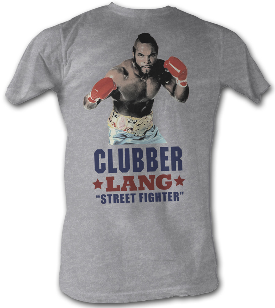 | | Rocky T-shirt Clubber Lang Street Fighter Adult Gray Tee ShirtThis Rocky Gray T-shirt features Clubber Lang the street fighter. Our Rocky T-shirt is a fantastic 100% preshrunk cotton t-shirt for any Rocky fan. Rocky is a popular 1976-2006 Boxing Movie Series. Available in Small, Medium, Large, XL & 2XL! Officially Licensed! |