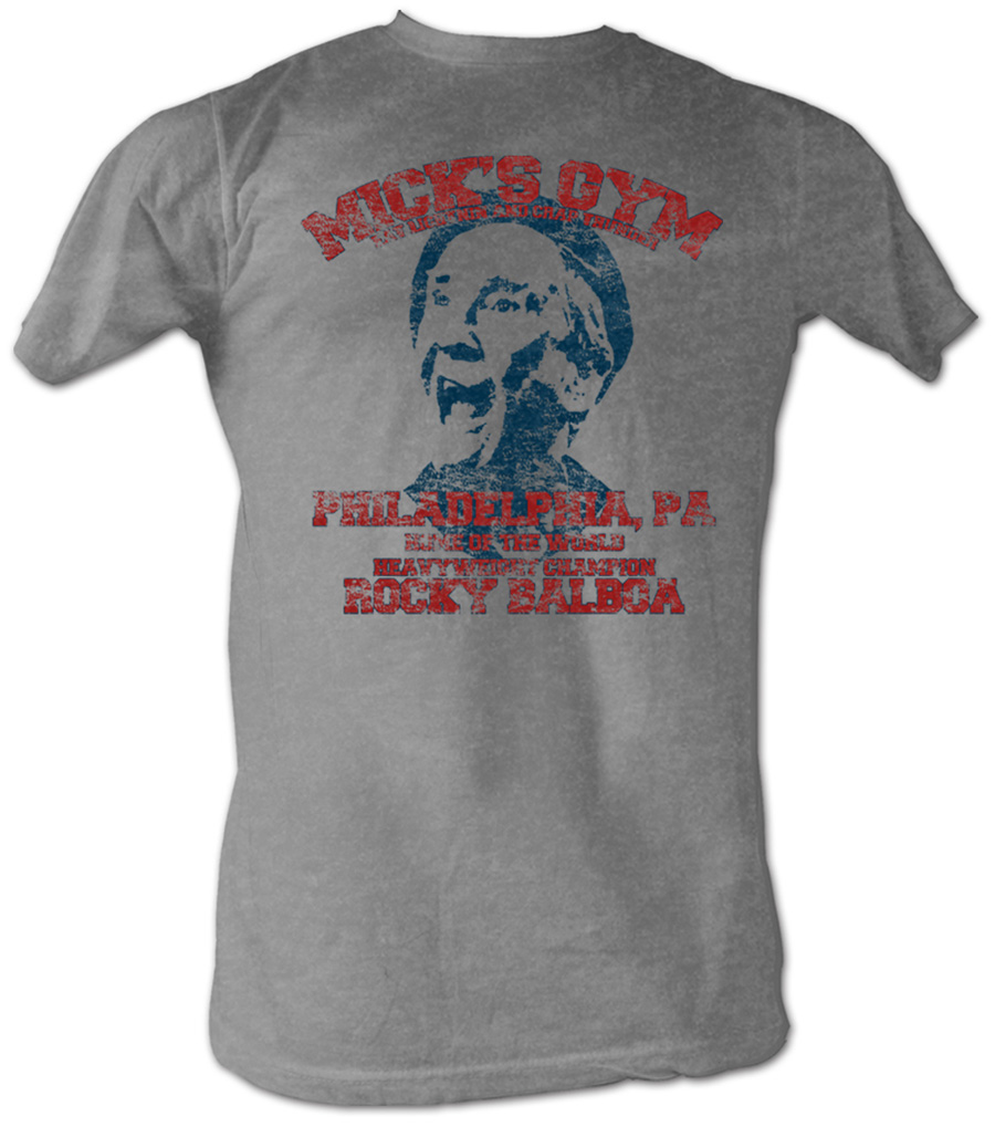 | | Rocky T-shirt Micks Gym Classic Adult Grey Heather Tee ShirtThis Rocky Grey T-shirt features a distressed design of Mick’s Gym with the famous slogan “Eat Lightnin and Crap Thunder.” On the bottom of the design it reads Philadelphia, PA Home Of The World Heavyweight Champion Rocky Balboa. Our Rocky T-shirt is an awesome 100% preshrunk cotton t-shirt for any Rocky fan. Rocky is an incredible American Sports Drama Movie series from 1976-2006 produced by Robert Chartoff and Irwin Winkler. Available in Small, Medium, Large, XL & 2XL! Officially Licensed! |