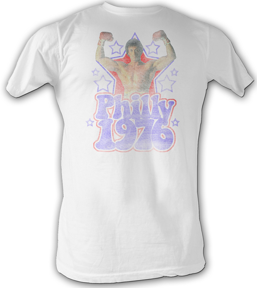 | | Rocky T-shirt Distressed Philly 1976 Adult White Tee ShirtThis Rocky White T-shirt is a distressed t-shirt featuring Rocky with his arms in the air and Philly 1976 written below. Our Rocky T-shirt is an awesome 100% preshrunk cotton t-shirt for any Rocky fan. Rocky is an incredible American Sports Boxing Film written by and starring Sylvester Stallone. Available in Small, Medium, Large, XL & 2XL! Officially Licensed! |