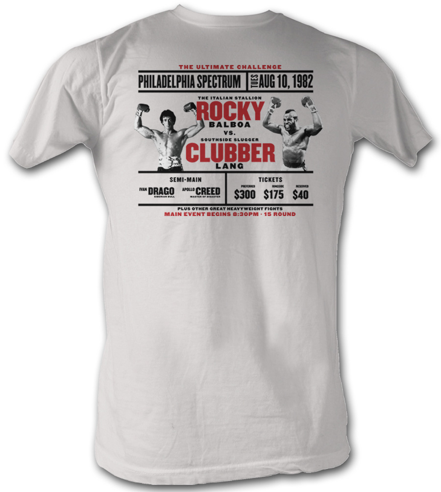 | | Rocky T-shirt Rocky VS Clubber Poster Adult Dirty White Tee ShirtThis Rocky Dirty White T-shirt features an Ultimate Challenge Poster of Rocky VS Clubber. Our Rocky T-shirt is a great 100% preshrunk cotton t-shirt for any Rocky fan. Rocky is an incredible American Film Series airing from 1976-2006. Available in Small, Medium, Large, XL & 2XL! Officially Licensed! |