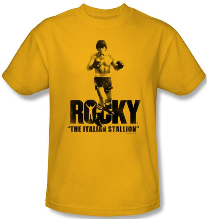 | | Rocky T-shirt The Italian Stallion Adult Gold Tee ShirtThis Rocky Gold T-shirt features an image of Rocky Balboa with a saying underneath that reads “Rocky The Italian Stallion.” Our Rocky T-shirt is a great 100% preshrunk cotton t-shirt for any Rocky fan. Rocky is a popular American movie series starring Sylvester Stallone as Rocky. Available in Small, Medium, Large, XL, 2XL & 3XL! Officially Licensed! |