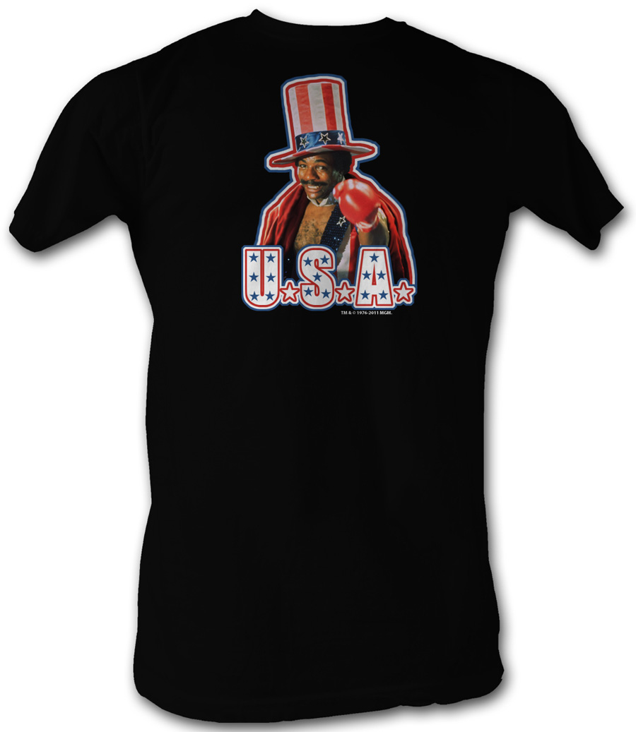 | | Rocky T-shirt USA Apollo Creed Adult Black Tee ShirtThis Rocky Black T-shirt features Apollo Creed wearing an American Flag Top Hat with USA written underneath. Our Rocky T-shirt is a fantastic 100% preshrunk cotton t-shirt for any Rocky fan. Rocky is an incredible American Film Series. Available in Small, Medium, Large, XL & 2XL! Officially Licensed! |