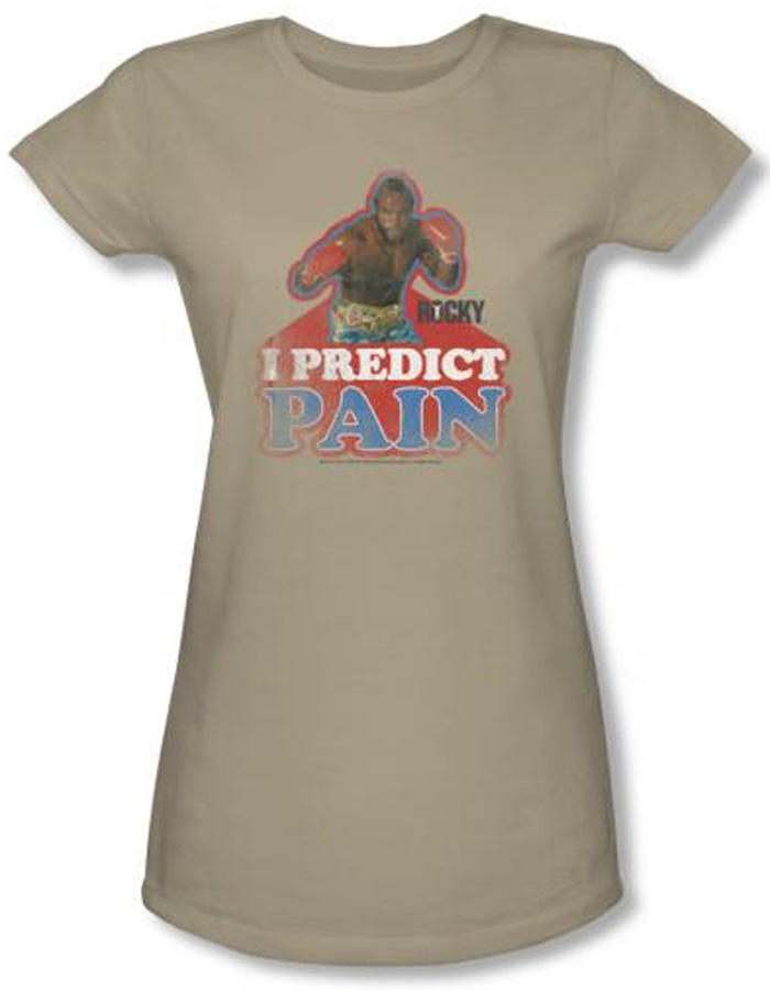 | | Rocky Juniors T-Shirt I Predict Pain Classic Sand Tee ShirtThis Rocky Sand Juniors T-shirt features Clubber Lang with a slogan that reads “I predict pain.” Our Rocky Juniors T-shirt is a perfect 100% preshrunk cotton baby doll t-shirt for any Rocky fan. Rocky is a great American boxing series starring Sylvester Stallone as Rocky. Available in Small, Medium, Large, XL! Officially Licensed! Also Available in Unisex Adult Sizes Rating: 4 Comment: Its a quality item and worth the money I spent. Name: Denise McMillan Location: Fort Stockton, Tx Date: 08/04/2011 |