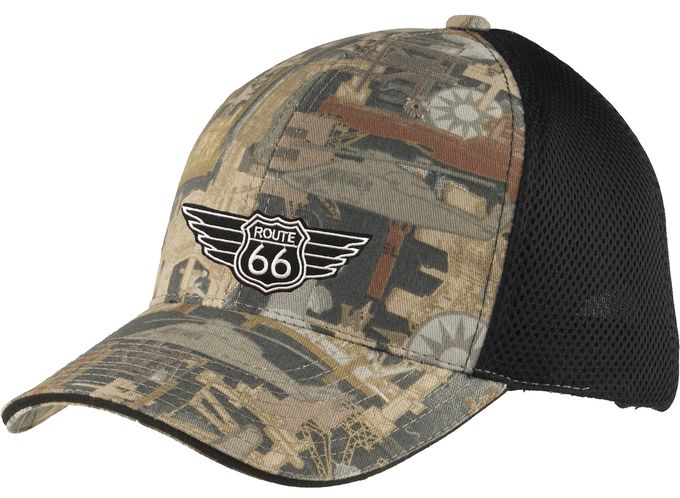 | | Rt Route 66 Adult Camo Mesh-Back Cap HatThe perfect mesh-back cap for those who are passionate about historic Rt 66! Fabric: 60/40 cotton/poly canvas 100% polyester air mesh mid and back panels. Mid-profile. Structured. Adjustable Hook and Loop strap (same as Velcro) in the back. This is not a fitted hat Features a fine embroidered patch for a cool 3D effect! One size fits most adult heads All orders ship from our Minneola, Florida USA location ![]() |
