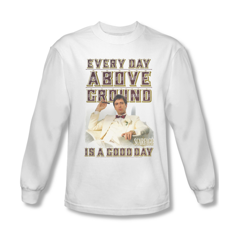 | | Scarface Shirt Above Ground Long Sleeve White Tee T-ShirtScarface Shirt Above Ground Long Sleeve White Tee T-Shirt Officially Licensed Available in Small, Medium, Large, XL, 2XL Our Scarface shirts is 1983 crime movie starring Al Pacino film perfect for any fans of this action movie. ![]() |