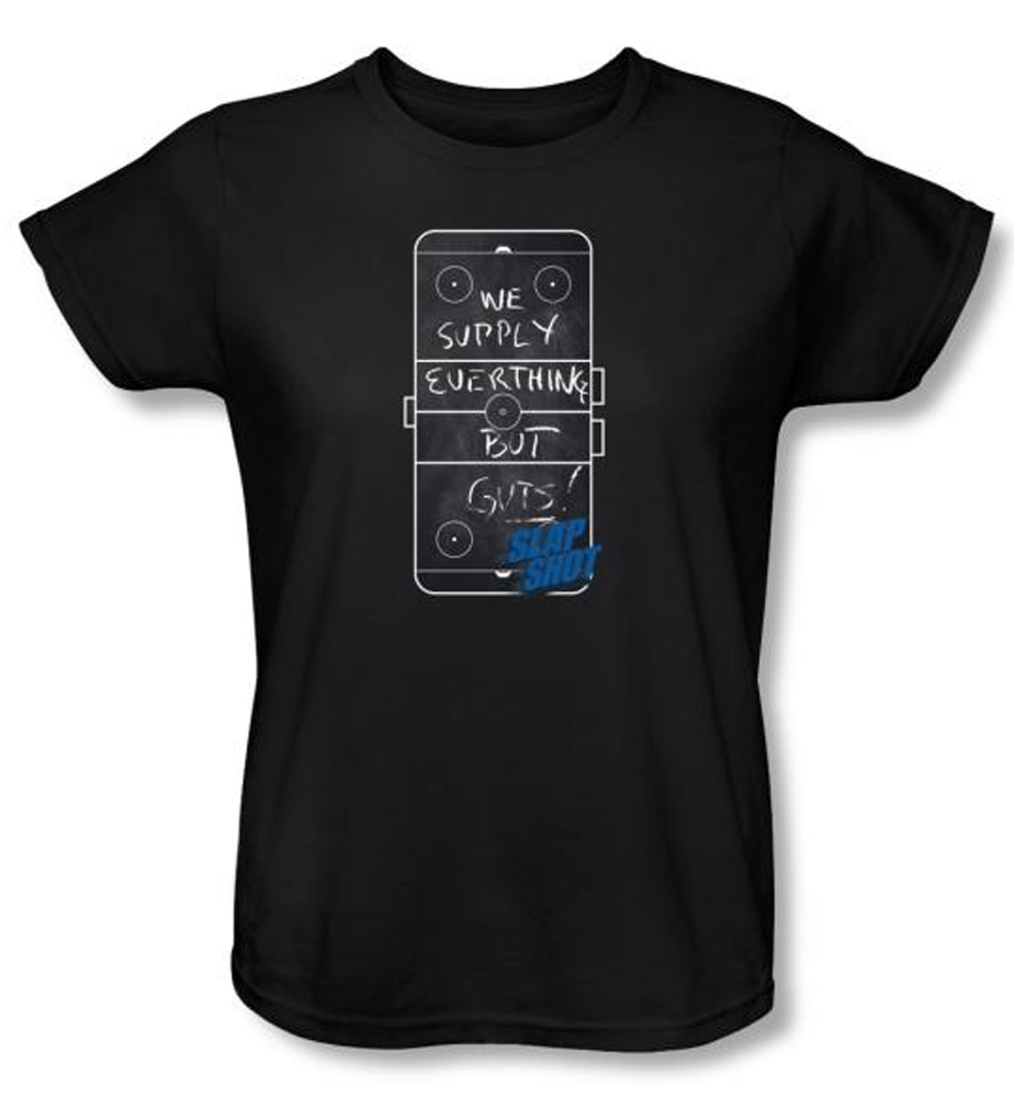 | | Slap Shot Ladies T-shirt Hockey Movie Chalkboard Black Tee ShirtSlap Shot Ladies T-shirt Hockey Movie Chalkboard Black Tee Shirt. This t-shirt features the movies chalkboard funny saying, they supply everything but guts. Available in Small, Medium, Large, XL, 2XL Officially Licensed |