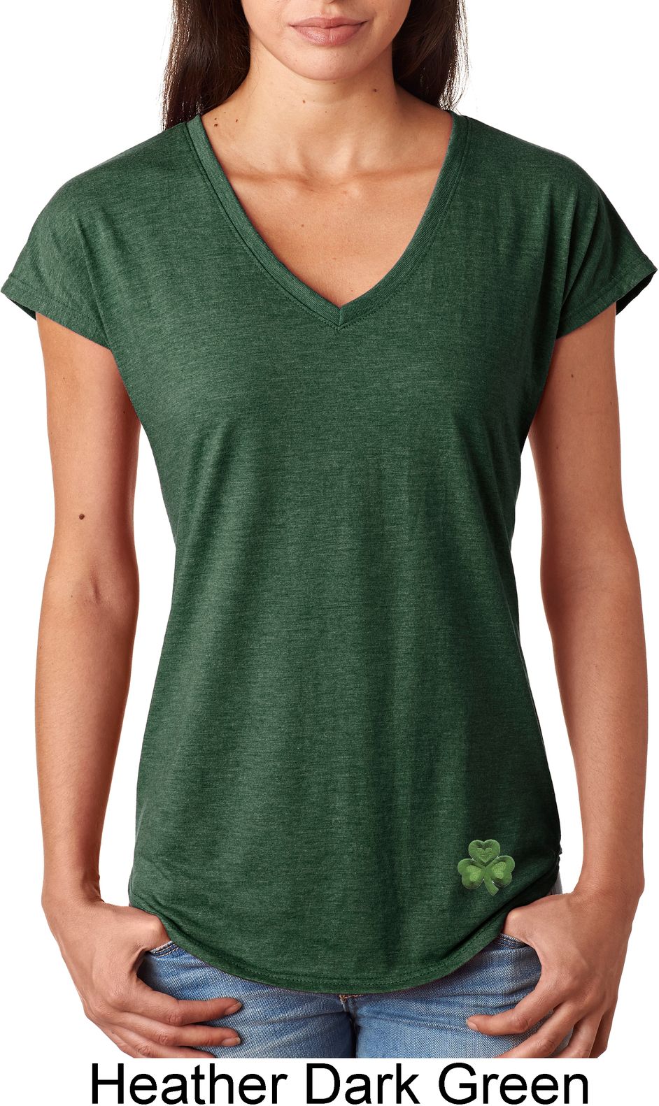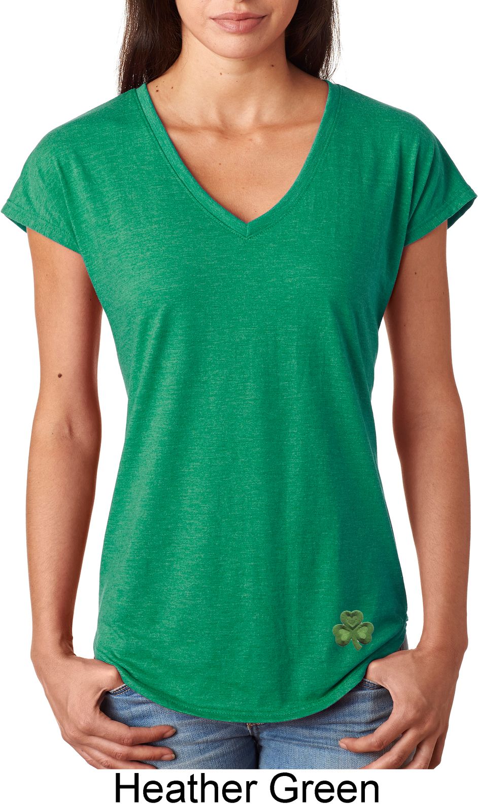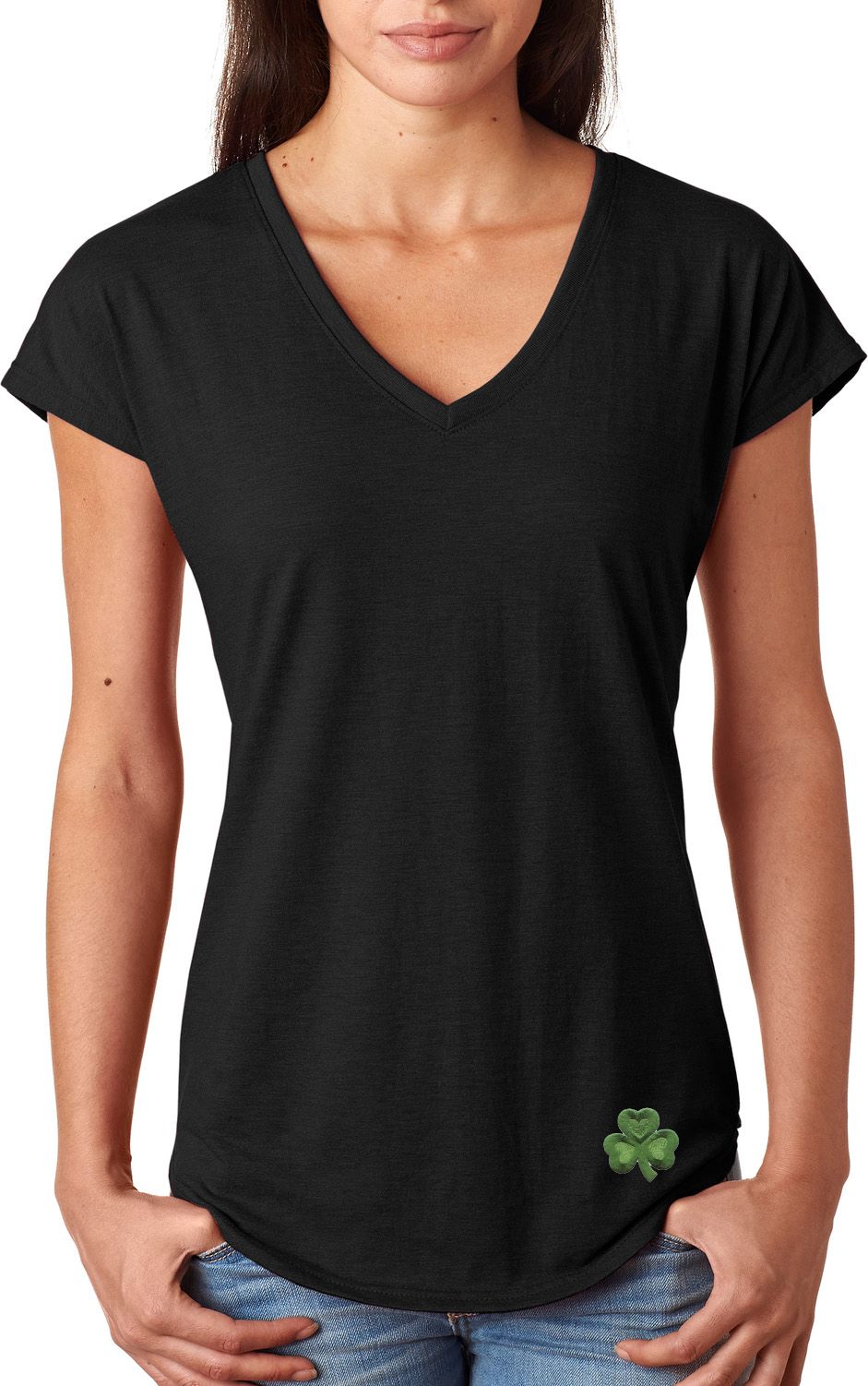 | | St Patricks Day Shamrock Patch Bottom Print Ladies Tri Blend V-neckA soft ladies v-neck featuring an Irish Shamrock patch on the bottom. Our ladies shirt is favored for its semi fitted silhouette and comfortable fit. It's made with a premium blend of poly/cotton/rayon. Available in sizes Small through 2XL. Machine wash cold with like colors; dry low heat. ![]() |