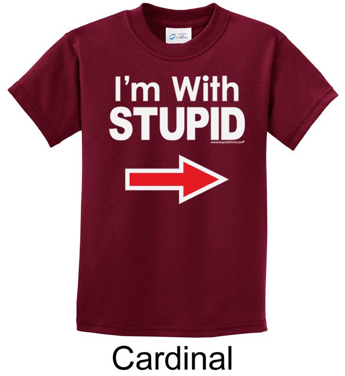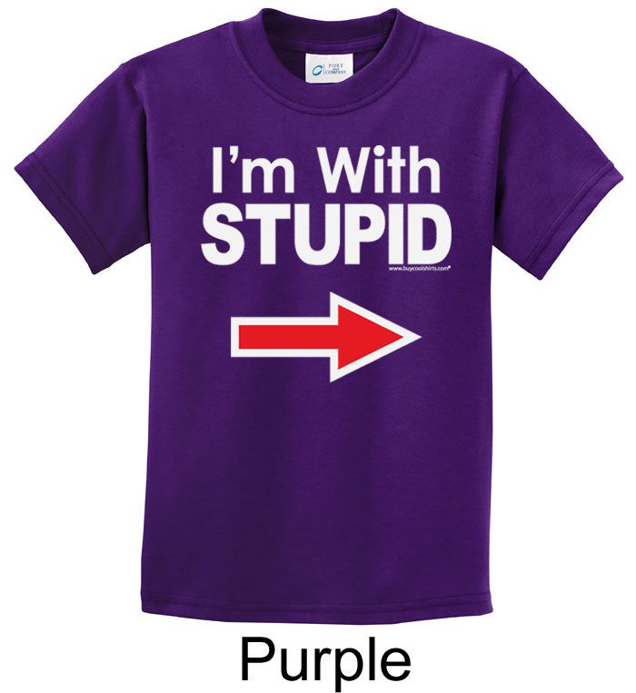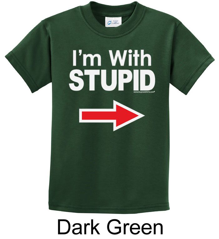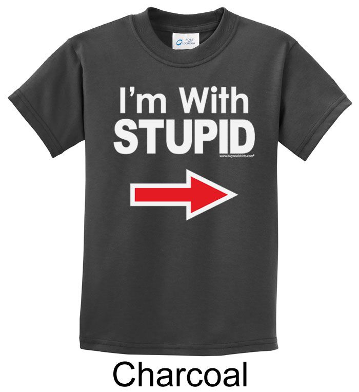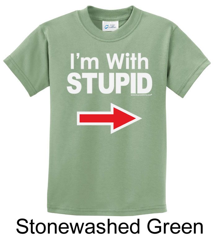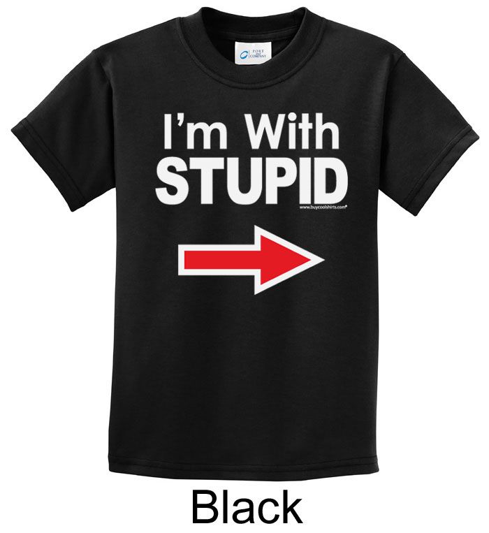 | | Stupid Shirt I’m With Stupid White Print Kids T-shirtAvailable in Youth Small, Youth Medium, Youth Large & Youth XL Also available in colors Red, Black, Brown, Cardinal, Charcoal, Dark Green, Deep Marine, Kelly Green, Navy, Orange, Purple, Royal, Sangria, Stonewashed Blue, & Stonewashed Green |