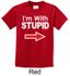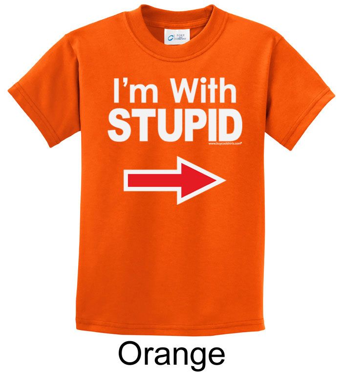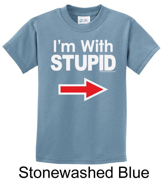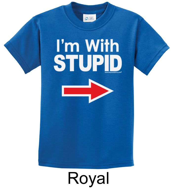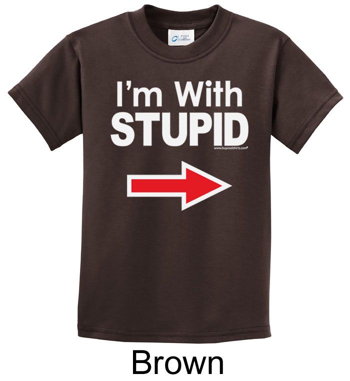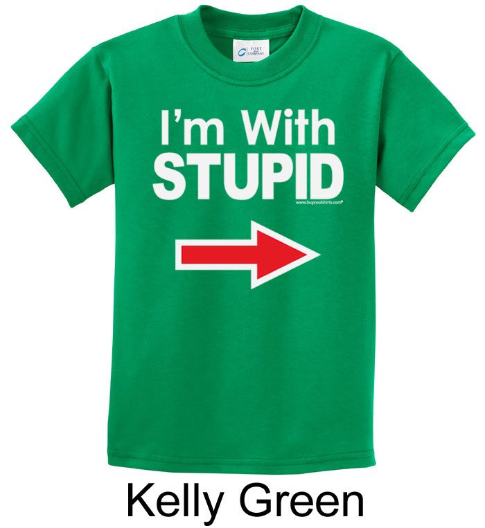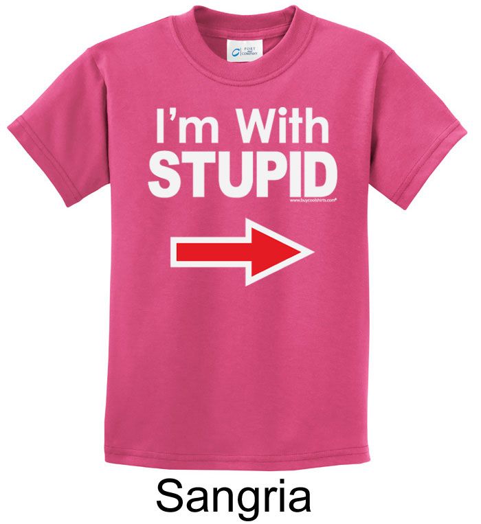 | | Stupid Shirt I’m With Stupid White Print Kids T-shirtAvailable in Youth Small, Youth Medium, Youth Large & Youth XL Also available in colors Red, Black, Brown, Cardinal, Charcoal, Dark Green, Deep Marine, Kelly Green, Navy, Orange, Purple, Royal, Sangria, Stonewashed Blue, & Stonewashed Green |