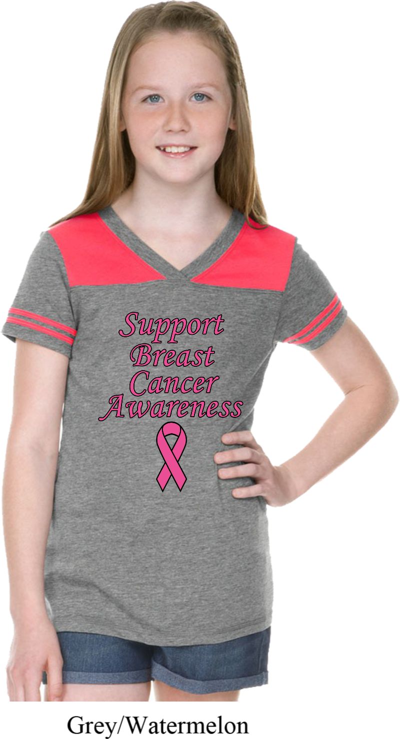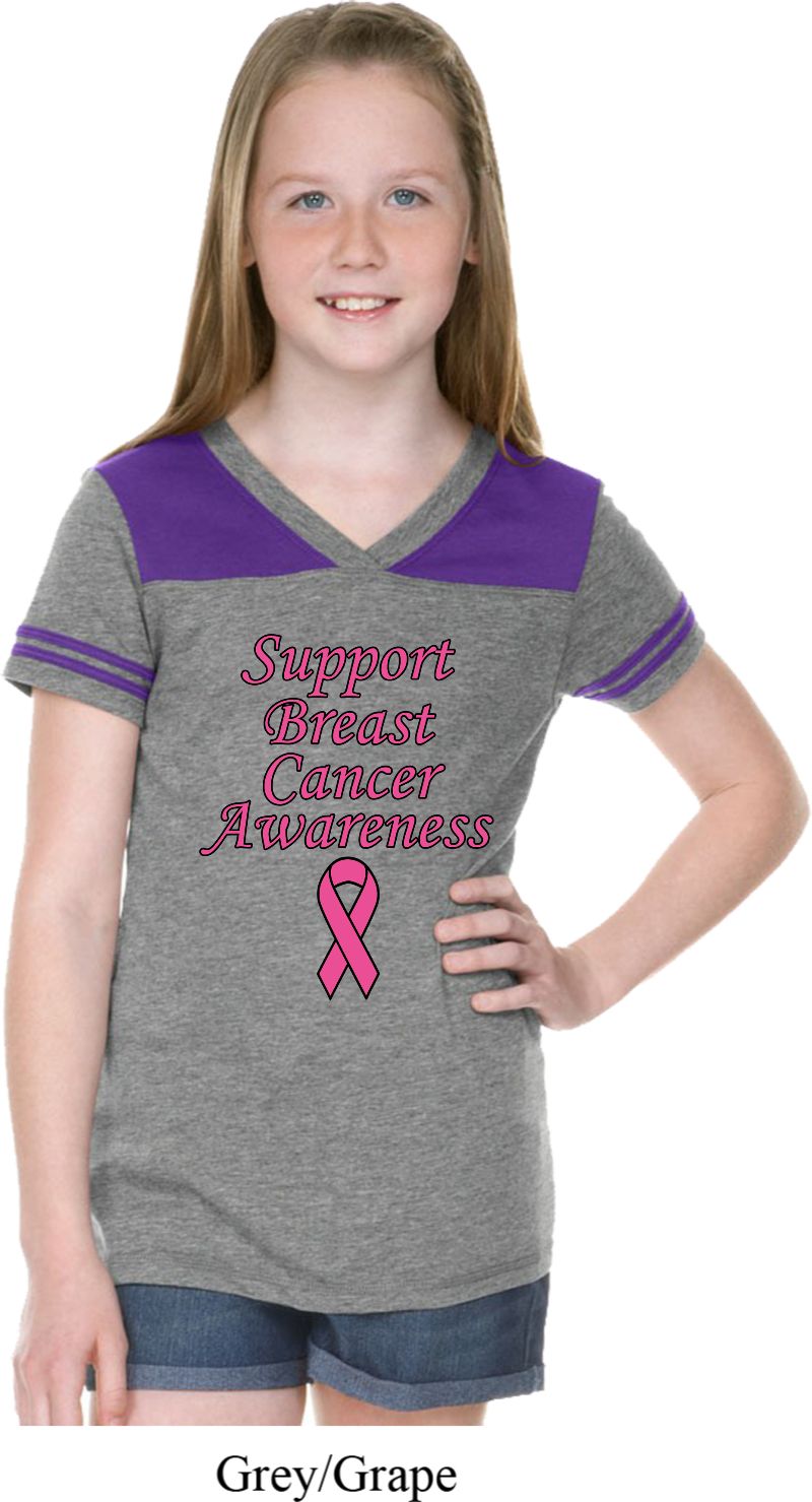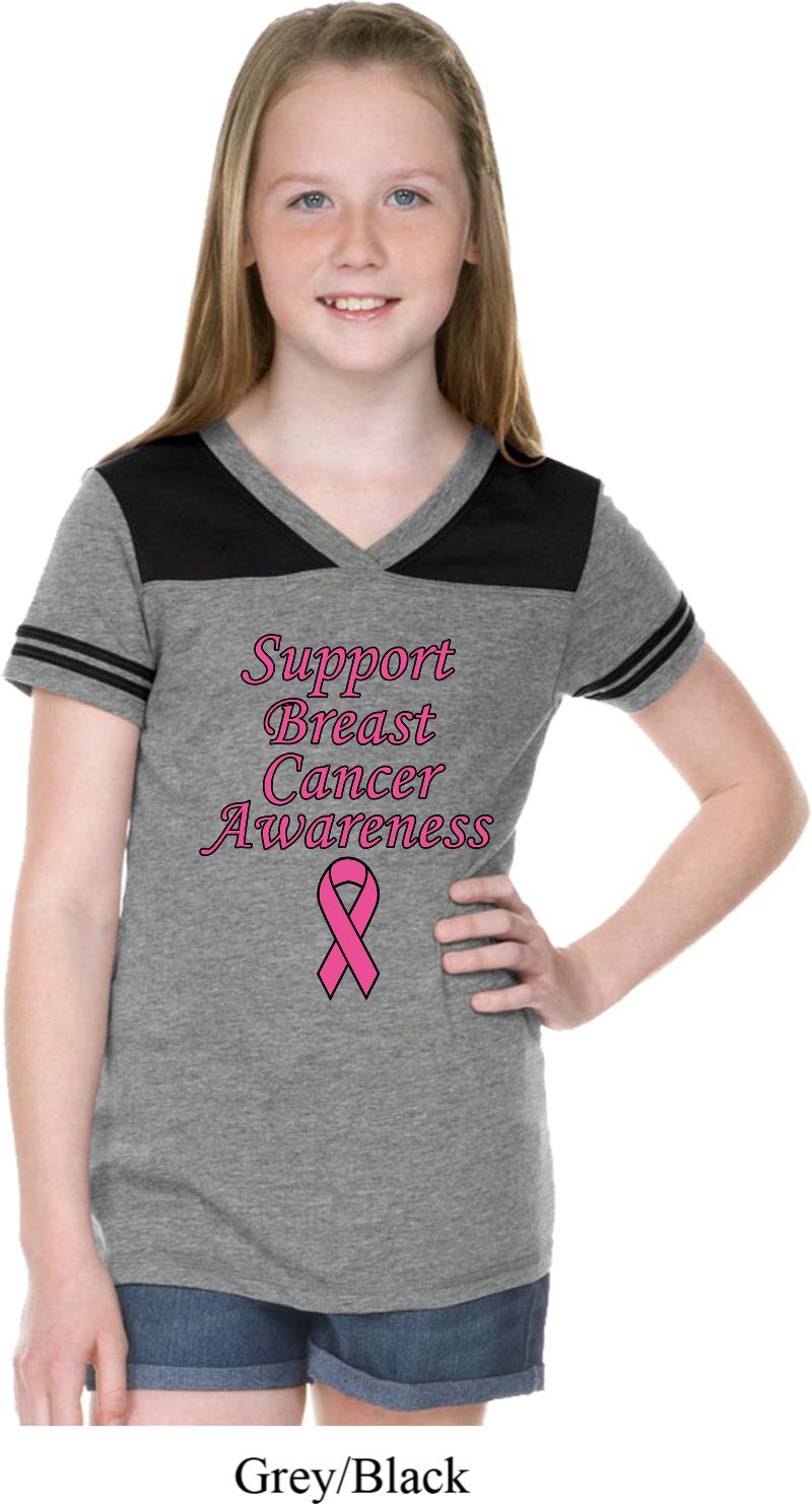 | | Support Breast Cancer Awareness Girls Football TeeA cute girls v-neck featuring Support Breast Cancer Awareness. Our girls shirt is made with a blend of cotton/poly. Support all fighting Breast Cancer while wearing our girls tee. Available in sizes Small through XL. Machine wash cold with like colors; dry low heat. ![]() |