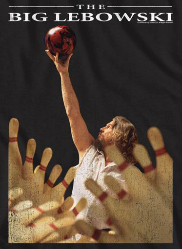 | | The Big Lebowski Dude with Bowling Ball T-shirtShow your support for The Dude with this cool Big Lebowski tee shirt Who knows what dreams you'll have when one of Maude's goons knocks you out?! 100% cotton Men's sizes (see size chart) in navigation menu Big and tall sizes available |