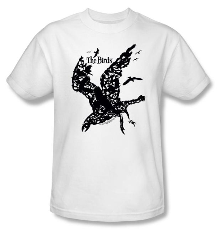 | | The Birds T-shirt Movie Title Adult White Tee ShirtThe Birds T-shirt Movie Title Adult White Tee Shirt features a stunning velveteen black image of a crow artistically comprised of a multitude of smaller black birds contrasting beautifully against white with title The Birds between wings. This t shirt makes an amazing gift for any fan as it epitomizes the dark 1963 suspense horror film The Birds directed by Alfred Hitchcock based on 1952 story "The Birds" by Daphne du Maurier where Cary Grant visiting the set told Tippi Hedren "I think you're the bravest lady I've ever met” after viewing her final scene when one bird gouged her cheek and narrowly missed her eye scaring and exhausting her a physician ordered a week's rest which Hedren said was riddled with "nightmares filled with flapping wings.” Available in Small, Medium, Large, XL, 2XL & 3XL Officially Licensed |
