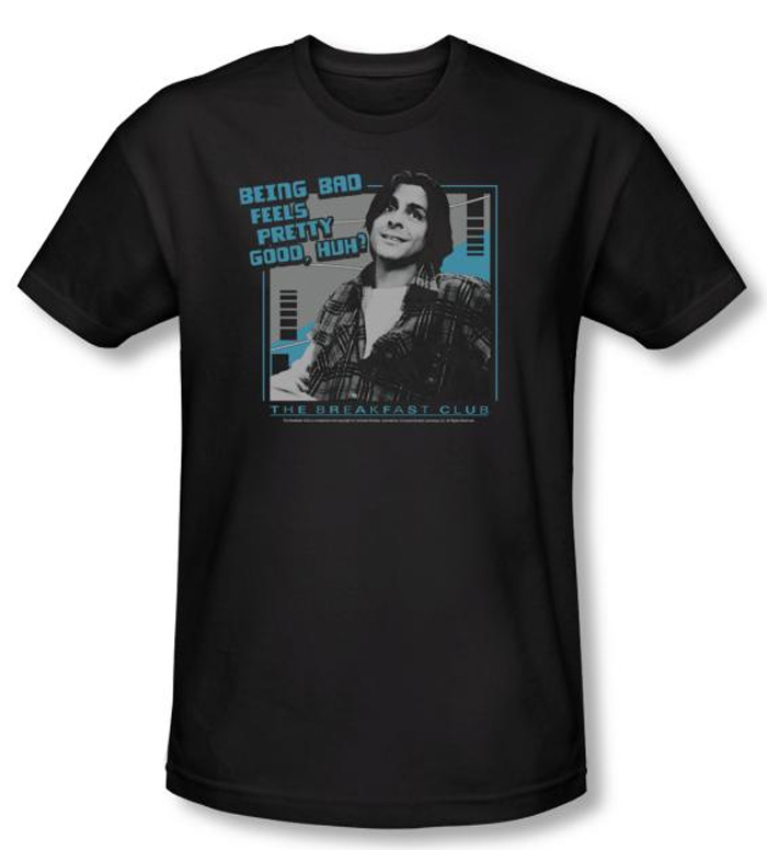 | | The Breakfast Club Slim Fit T-shirt Movie Bad Adult Black ShirtThe Breakfast Club T-shirt Movie Bad Slim Fit Adult Black Shirt features an image of a smiling Bender running wild in blue flannel shirt while riling up fellow students during detention with phrase Being Bad Feels Pretty Good, Huh? as movie title The Breakfast Club sits below. Our t shirts incredible fit makes an outrageous gift for any fan of John Hughes’ 1985 film The Breakfast Club and of course Judd Nelson who went to school at St. Paul’s School in Concord, NH and Waynflete School in Portland, ME going on to study at Haverford College in PA then choosing to leave during his sophomore year to pursue his dream of acting subsequently moving to Manhattan to study with Stella Adler. Available in Small, Medium, Large, XL, 2XL Officially Licensed |