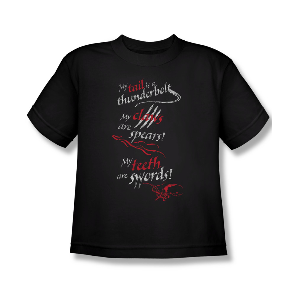 | | The Hobbit Desolation Of Smaug Shirt Kids Tail Claws Black Youth Tee T-ShirtThe Hobbit Desolation Of Smaug Shirt Kids Tail Claws Black Youth Tee T-Shirt Officially Licensed Available in Small(6-8), Medium(10-12), Large(14-16), & XL(18-20), Also available in Toddler sizes: Small (4), Medium (5/6), & Large (7) The Hobbit Desolation Of Smaug shirts is a 2013 epic fantasy adventure film perfect for any fans of this movie. ![]() |