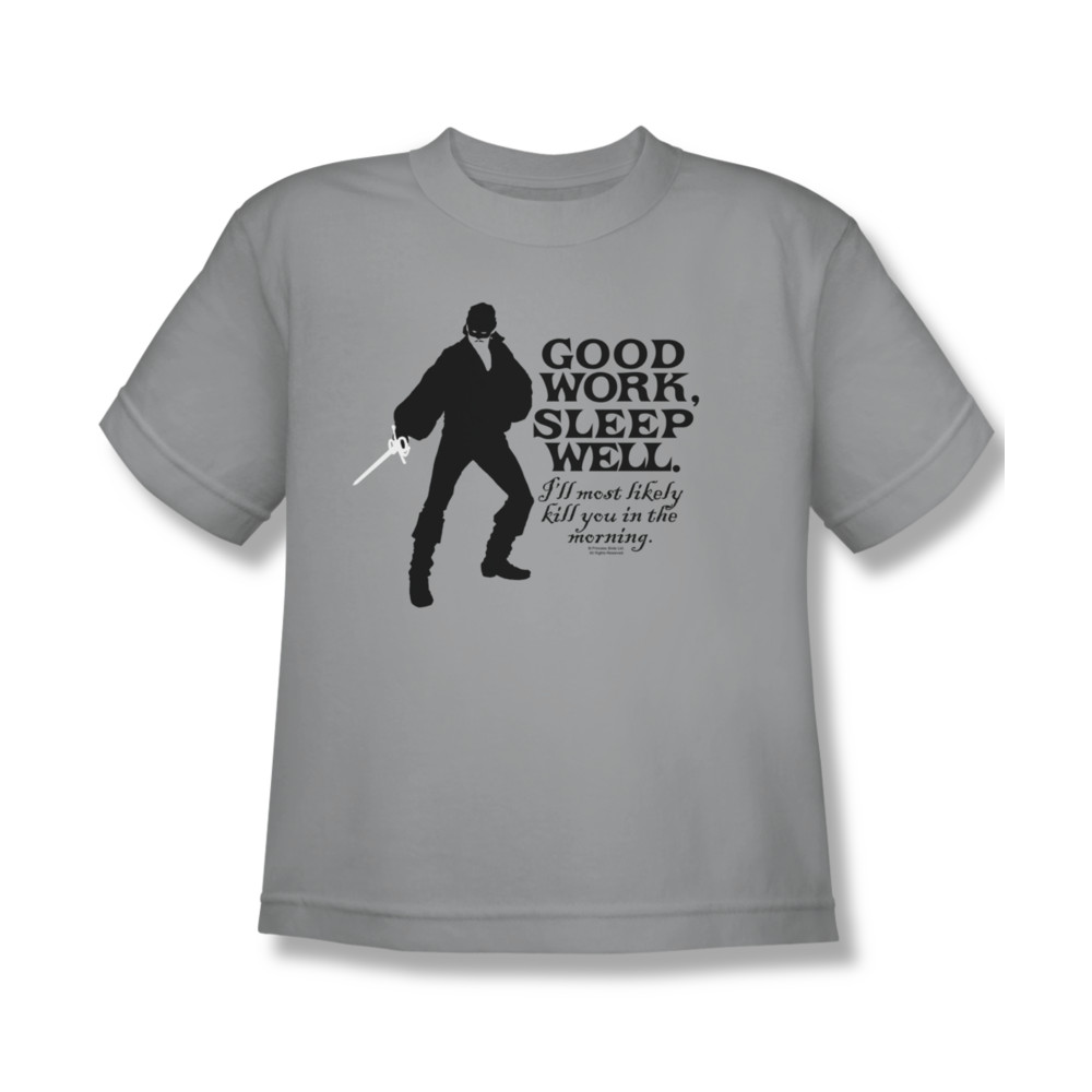 | | The Princess Bride Shirt Kids Good Work Silver Tee T-ShirtThe Princess Bride Shirt Kids Good Work Silver Tee T-Shirt Officially Licensed Available in Small(6-8), Medium(10-12), Large(14-16), & XL(18-20), Also available in Toddler sizes: Small (4), Medium (5/6), & Large (7) Our The Princess Bride shirts is classic 1987 film perfect for any fans of this movie. ![]() |