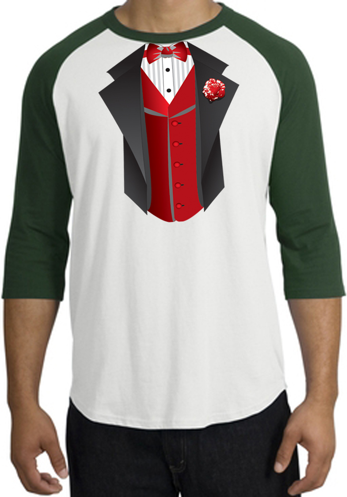 An awesome white/forest tuxedo with red vest funny humor novelty adult 3/4 sleeve raglan t-shirt