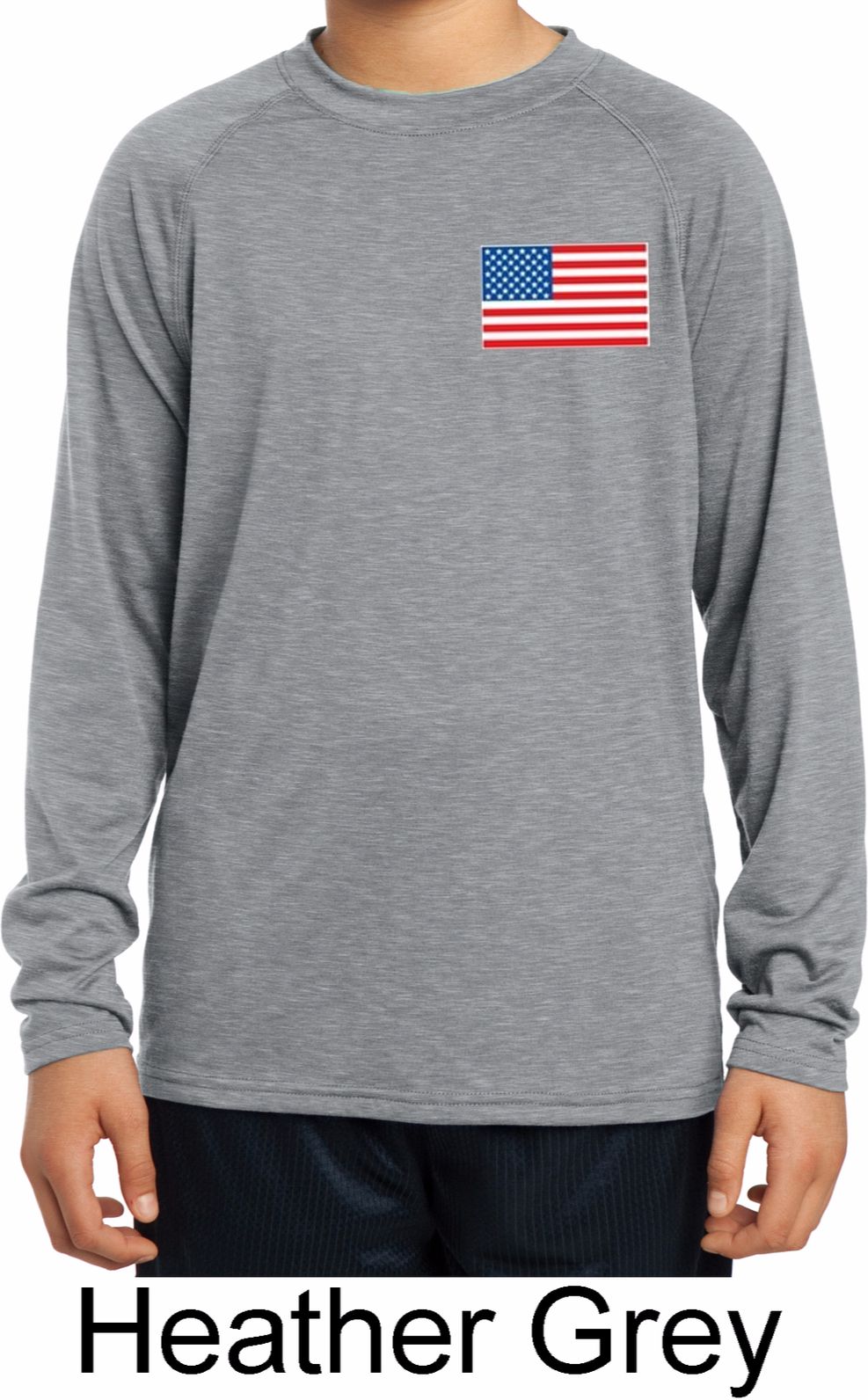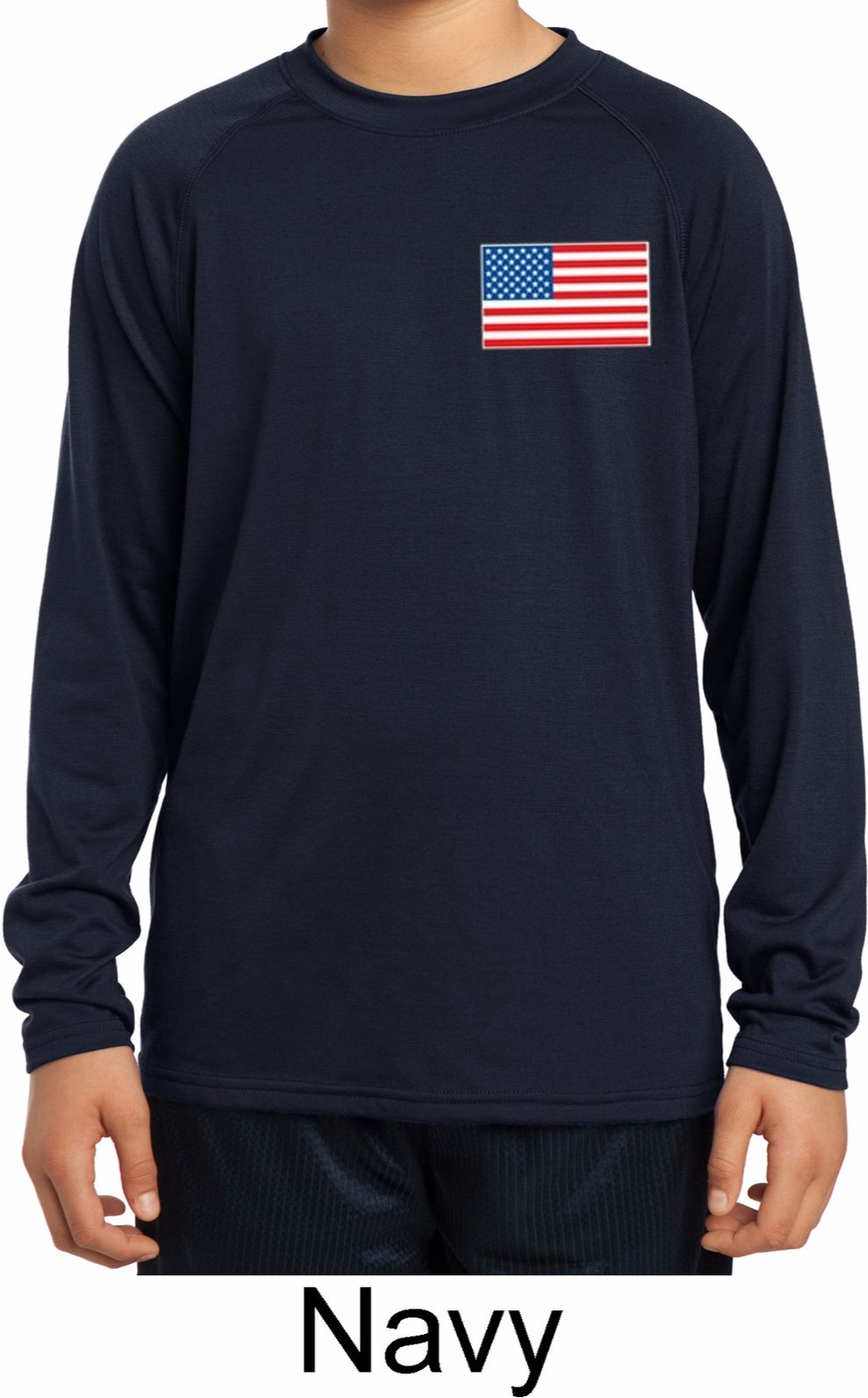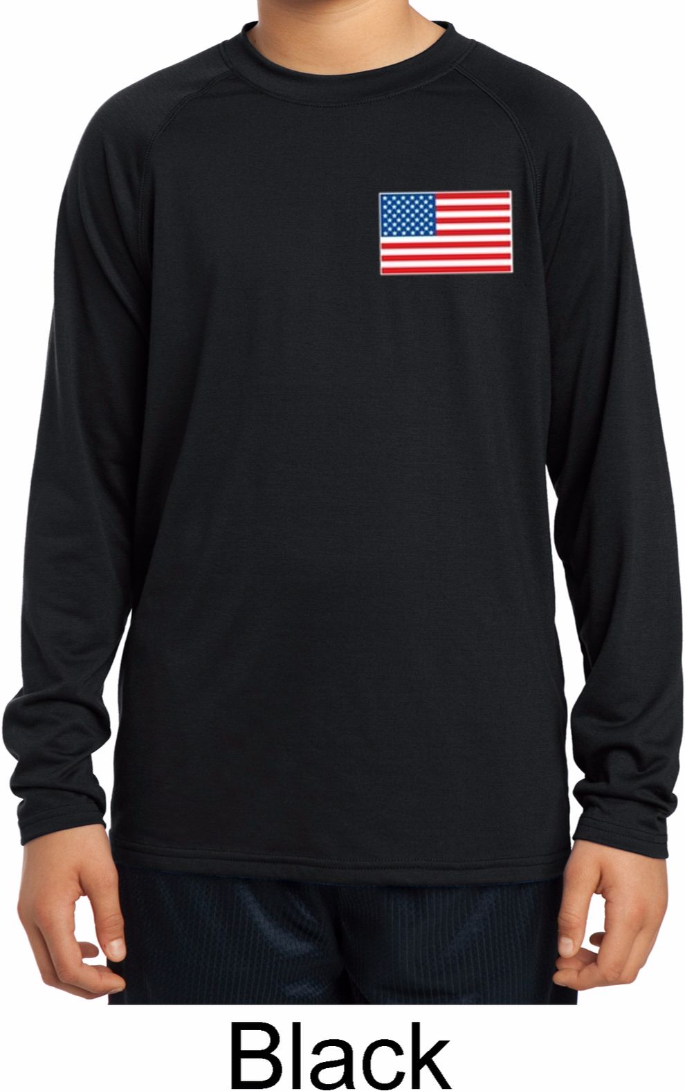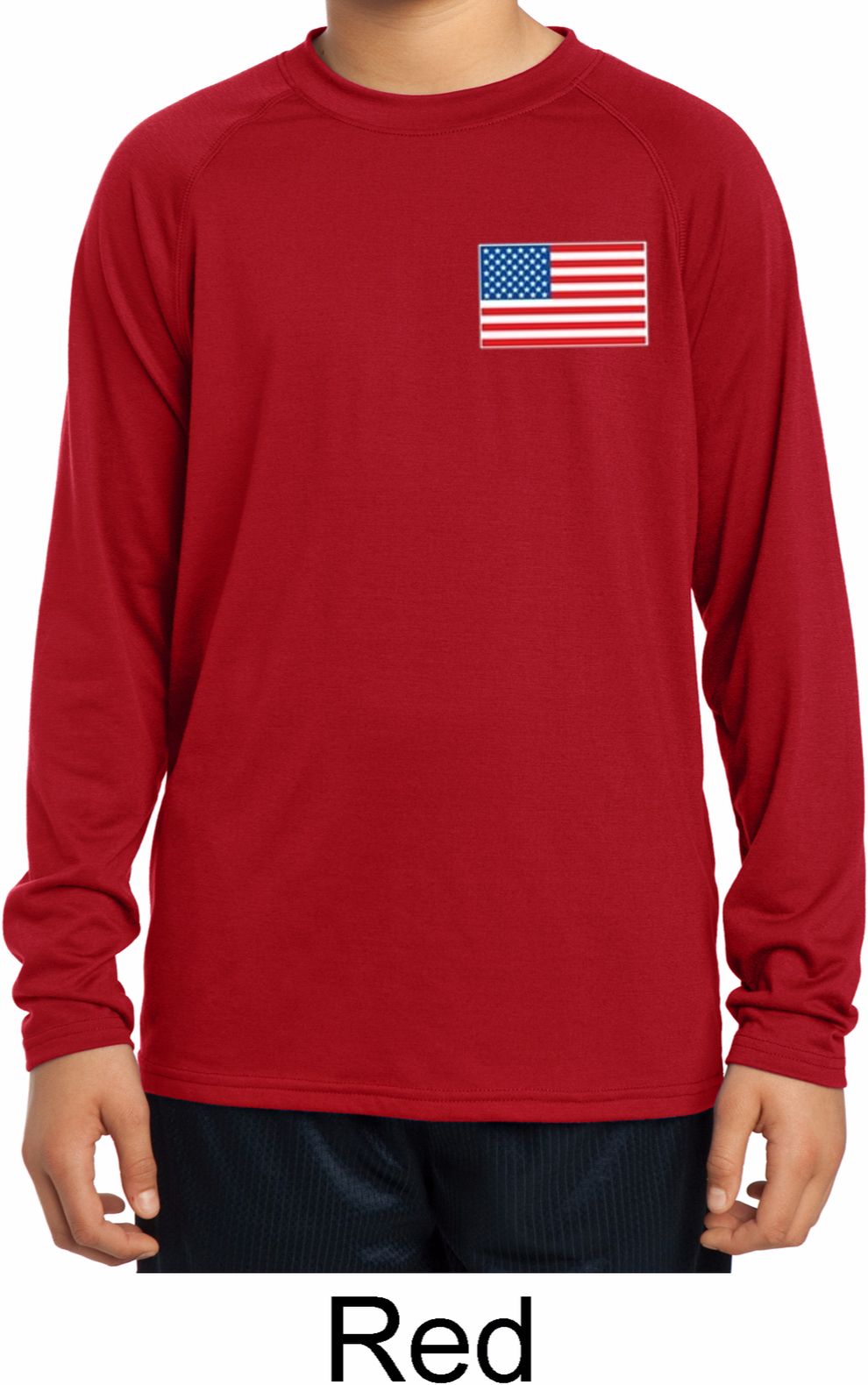 | | US Flag Pocket Print Kids Dry Wicking Long Sleeve ShirtUS Flag Pocket Print Kids Dry Wicking Long Sleeve Shirt Show your love for the United States of America while wearing our US flag design Poly/Spandex Available in Youth Small, Youth Medium, Youth Large & Youth XL Also available in colors Black, Heather Grey, Navy, Red, Royal, and White Product Reviews