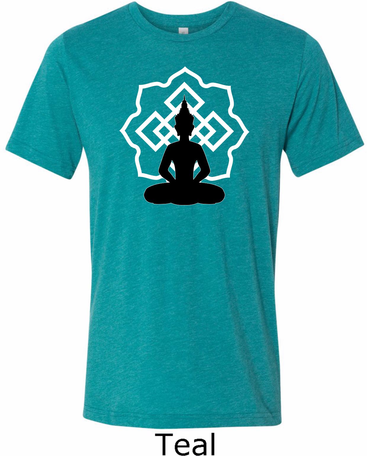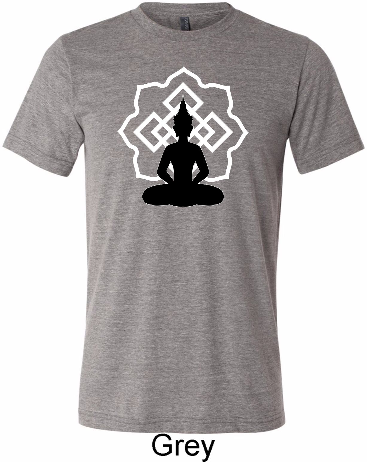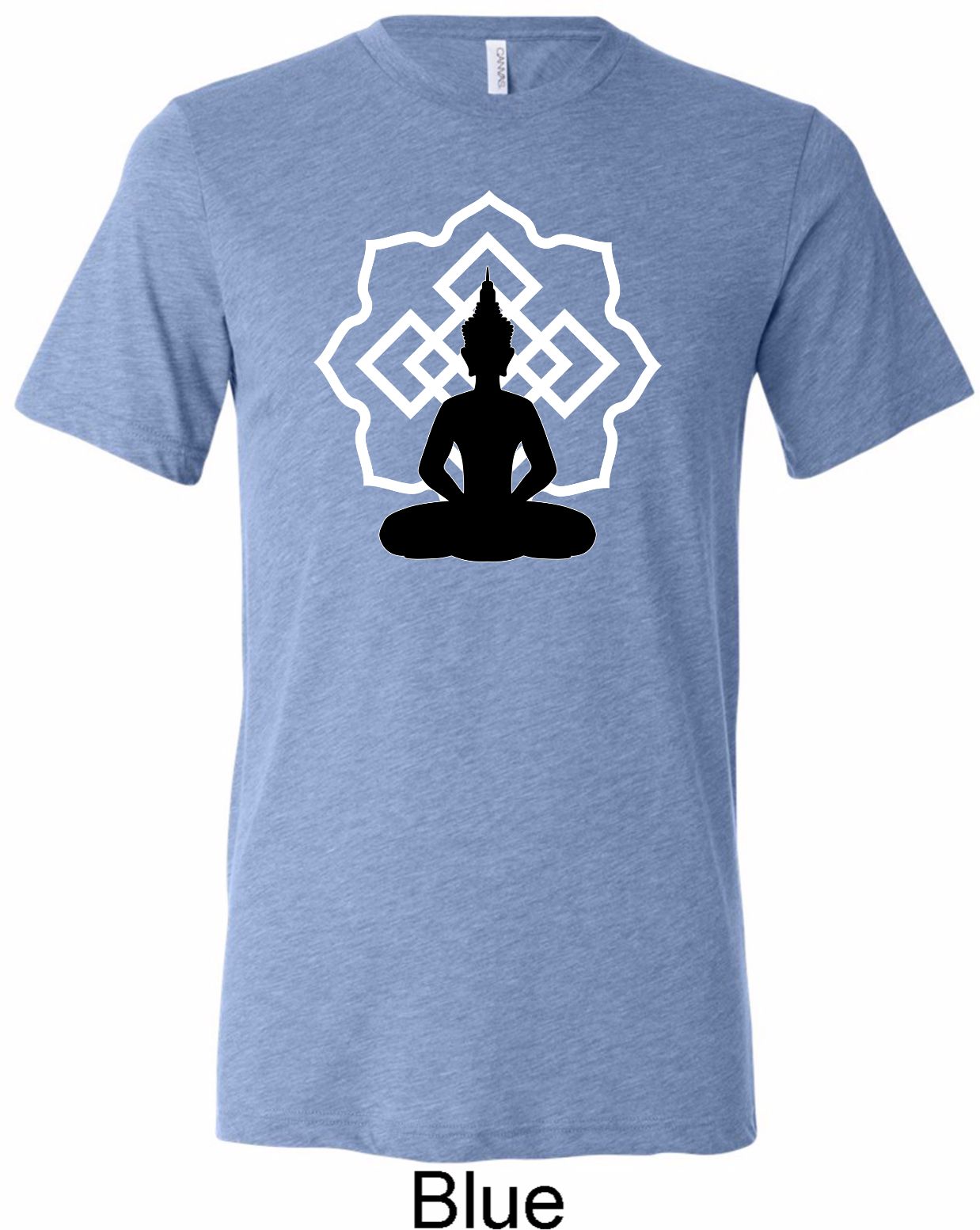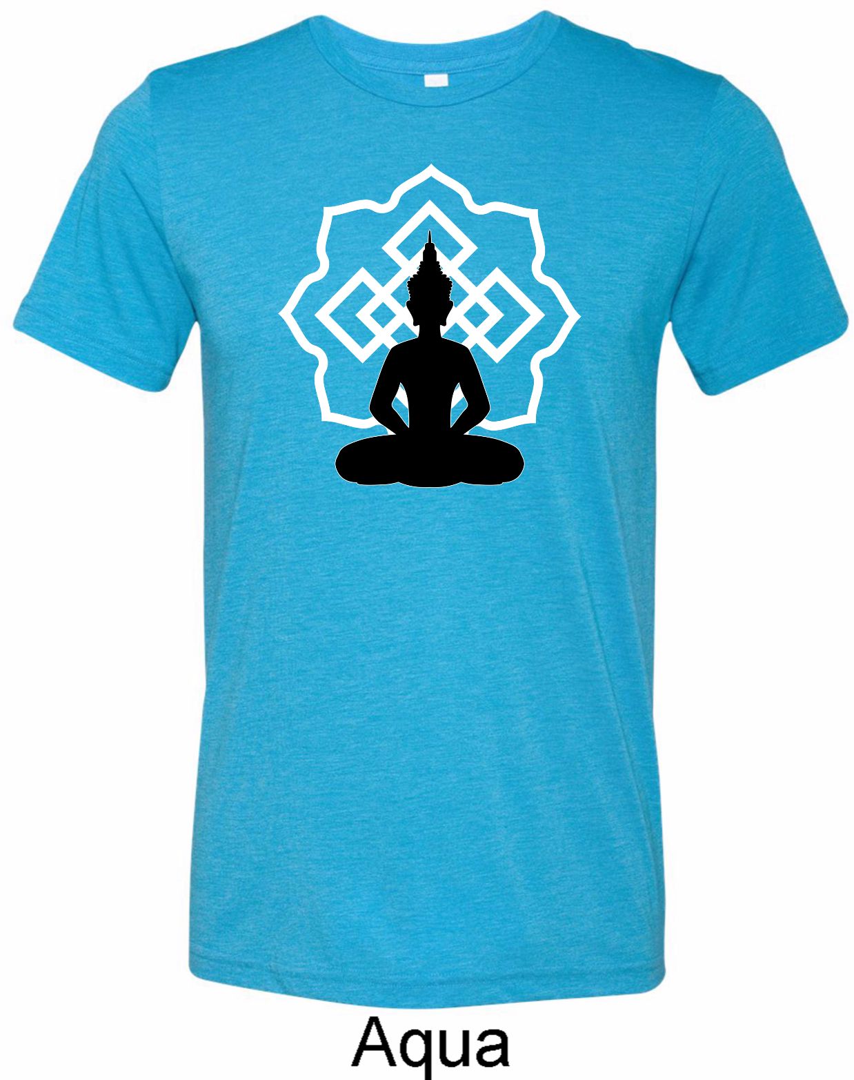 A mens tri blend shirt featuring Buddha inside a lotus flower. Our mens tee is made with a blend of poly/cotton/rayon. Available in sizes Small through 3XL. Machine wash cold with like colors; dry low heat.