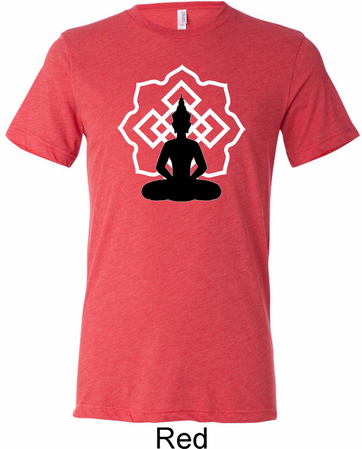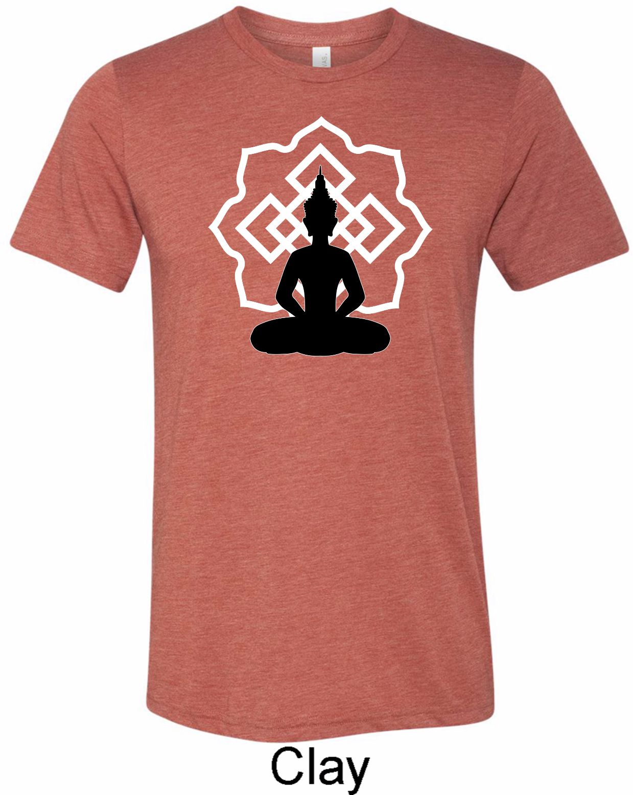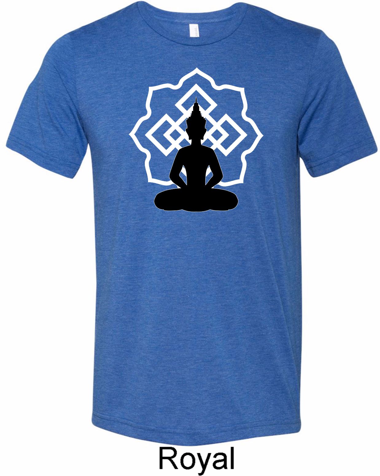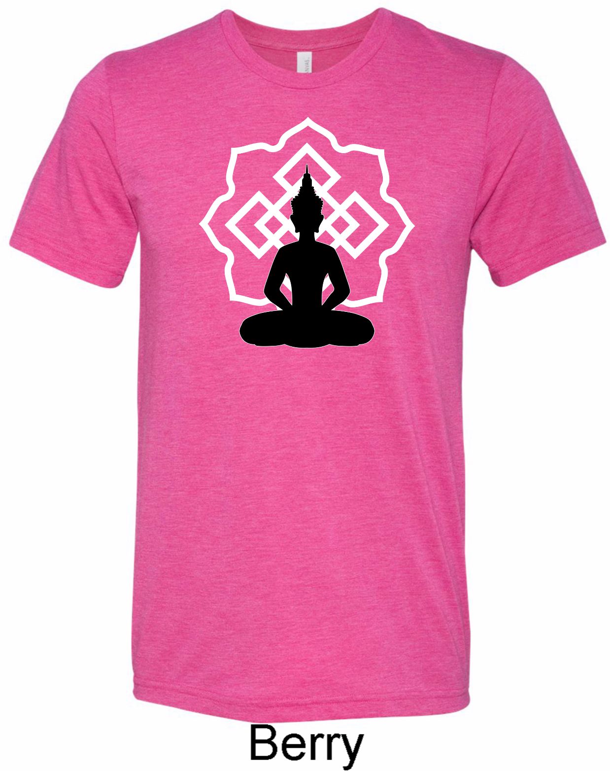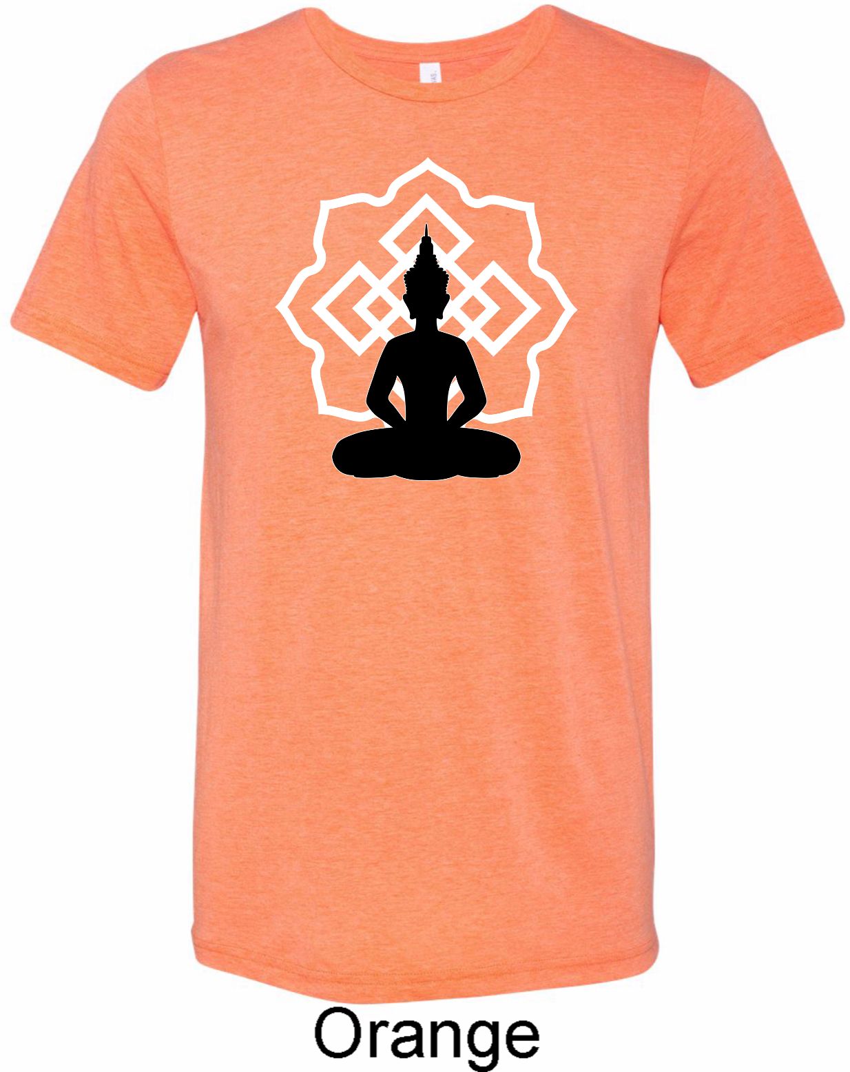 A mens tri blend shirt featuring Buddha inside a lotus flower. Our mens tee is made with a blend of poly/cotton/rayon. Available in sizes Small through 3XL. Machine wash cold with like colors; dry low heat.